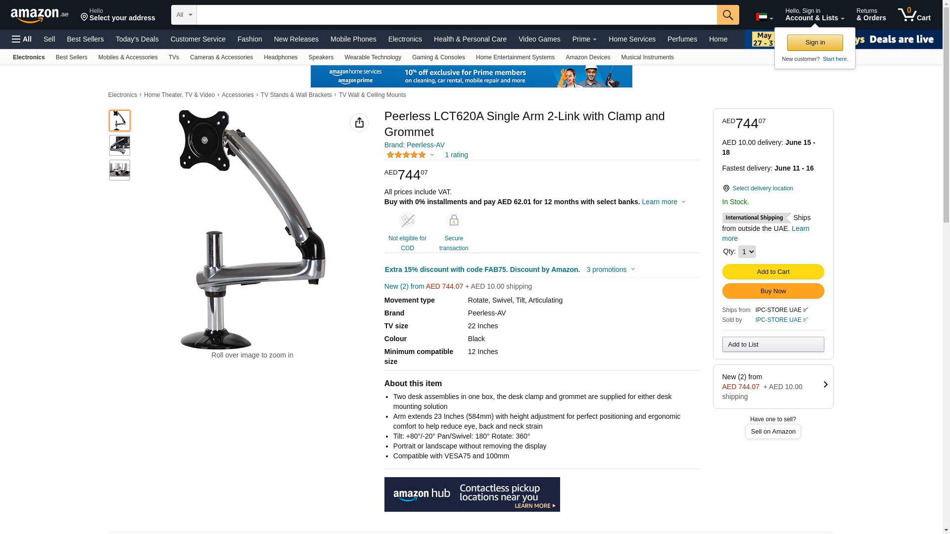 The LCT620A and LCT620A-G desktop monitor mounts feature an attractive, height-adjustable articulating arm that provides perfect ergonomics with optimal monitor positioning for virtually all users. Choose between a clamp or grommet mounting base for unlimited mounting options on any desk or countertop surface between ½ to 2 (12 to 55Â mm) thick. Height Adjustable: Yes Application/Use: Desktop Package Contents: Pole Arm Base with Adapter Mounting Hardware and Instructions Product Type: Mounting Arm Device Holder: Monitor Device Holder: Flat Screen Product Type: Mounting Arm Compatibility: Monitor Device Mount: Monitor Device Mount: Flat Screen Manufacturer Part Number: LCT620A Packed Quantity: 1 Limited Warranty: 5 Years Weight (Approximate): 11 lbs. Features: Adjustable Features: Adjustable Features: Adjustable Features: Ergonomic Features: 3 60° Rotation Features: Cable management features. Features: Pan Features: Articulating Manufacturer: Peerless Industries, Inc Product Model: LCT620A Product Name: LCT620A Series Desktop Mount for up to 38 Flat Panel Displays Maximum Load Capacity: 17.80 lbs. Brand Name: Peerless-AV Product Series: 620A Maximum Load Capacity: 17.80 lbs. Brand Name: Peerless-AV Country of Origin: Taiwan. a Country of Origin: Tt Country of aiwan Maximum Supported Screen Size: 38 VESA Mount Standard: 100 x 100 VESA Mount Standard: 75 x 75 TAA Compliant: Yes Product Color: Brushed Aluminum Color Color: Black Eco Friendly: Yes Environmental Certification: RoHS Maximum Supported Screen Size: 38 VESA Mount Compatible: Yes VESA Mount Standard: 100 x 100 VESA Mount Standard: 75 x 75 TC x AA Compliant: Yes. Product colour: polished aluminium. Product colour: black. Product material: aluminum