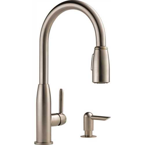 This Apex Integrated Single-Handle Pull-Down Sprayer Kitchen Faucet in Stainless with Soap Dispenser is an easy and affordable way to update the look of your kitchen. Its simple design complements a variety of design styles. The included escutcheon completes the ensemble for a more finished look.