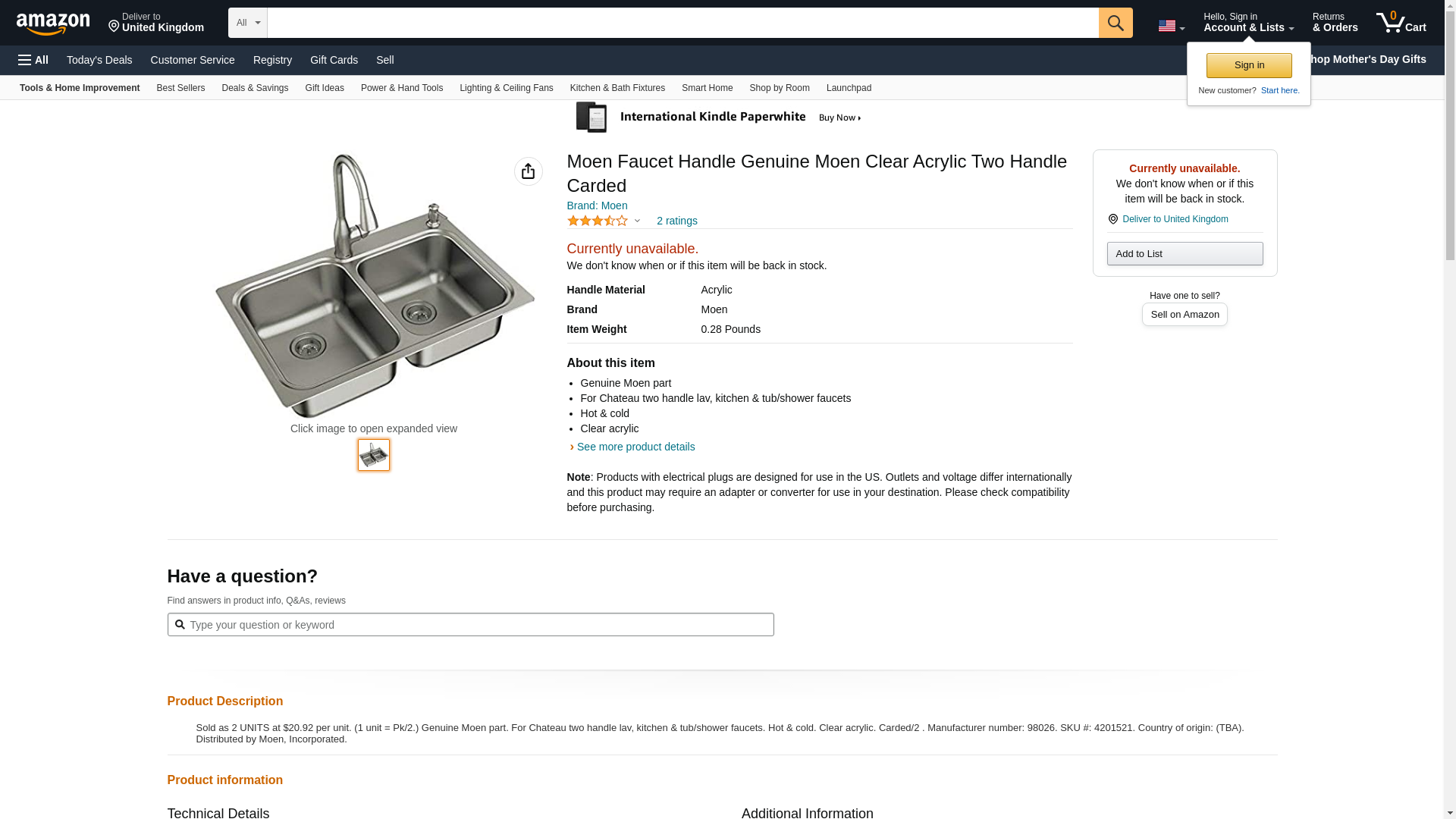 Sold as 2 UNITS at $20.92 per unit. (1 unit = Pk/2.) Genuine Moen part. For Chateau two handle lav, kitchen & tub/shower faucets. Hot & cold. Clear acrylic. Carded/2 . Manufacturer number: 98026. SKU #: 4201521. Country of origin: (TBA). Distributed by Moen, Incorporated.