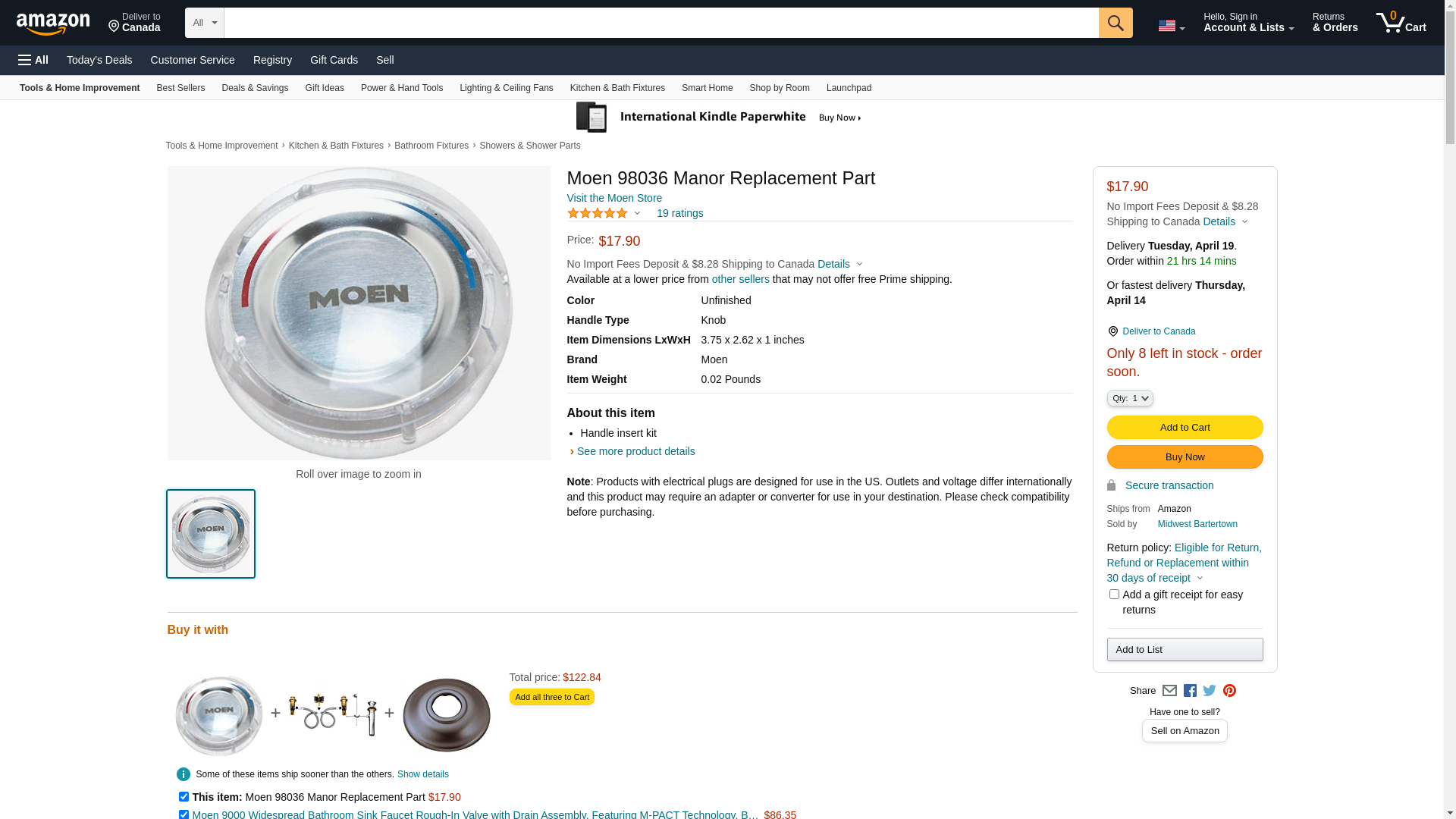 Sold as 2 UNITS at $12.37 per unit. (1 unit = each.) Acrylic knob insert. For touch control single handle bathroom faucet and tub/shower handle. Manufacturer number: 98036. SKU #: 4299657. Country of origin: (TBA). Distributed by Moen, Incorporated.