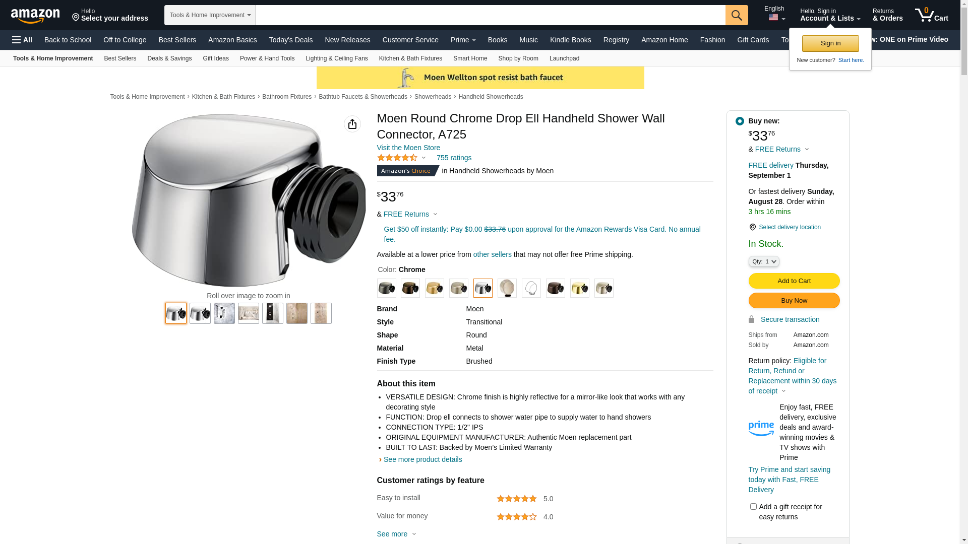 From finishes that are guaranteed to last a lifetime, to faucets that perfectly balance your water pressure, Moen sets the standard for exceptional beauty and reliable, innovative design. This Chrome drop ell is manufactured by Moen, the #1 faucet brand in North America. This product features a chrome finish to create a bright, highly reflective, cool grey metallic look.