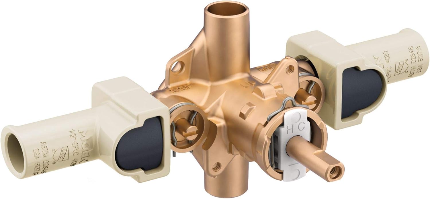 Product Features: Valve is constructed of brass ensuring durability and dependability Covered under Moen's limited lifetime for residential installations and 5-year limited for commercial installations Features Moen's M-PACT® common valve system Posi-Temp® pressure balancing valve maintains water pressure and controls temperature Designed for CPVC inlet / outlet connections Integrated service stops allow you to turn water off at the valve Back-to-back installation capabilities Sturdy mounting bracket included with valve Note: This is the rough-in valve only - valve trim is required to complete product Sold Individually Product Technologies / Benefits: M-PACT® Common Valve System: This innovation from Moen gives the homeowner the up-most functionality and convenience when it comes to bathroom faucets. Designed to be a catch-all valve system, once M-PACT® is installed you can upgrade the style of the lavatory or shower faucet without replacing nay of the faucet plumbing. Posi-Temp® Valve: A pressure balancing valve that maintains water temperature within 3° F. Built-in temperature limit stops allow you to control how far the handle rotates, in effect controlling the range of water temperature. The Posi-Temp® offers the best water flow available for any comparable valve. Product Specifications: Connection Size: 1/2" Connection Type: CPVC Cartridge Included: 1222 Number of Ports: 4 Variations: 62330: This model 62300: IPS connections, no stops 62320: Sweat (CC) connections, no stops 62340: CPVC connections, no stops 62360: PEX connections, with stops 62365: Cold expansion PEX connections, no stops 62370: Sweat (CC) connections, with stops 62380: PEX connections, no stops 62385: Cold expansion PEX connections, with stops 62390: IPS connections, with stops Different Types of Valve Inlet / Outlet Connections: