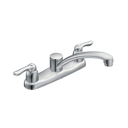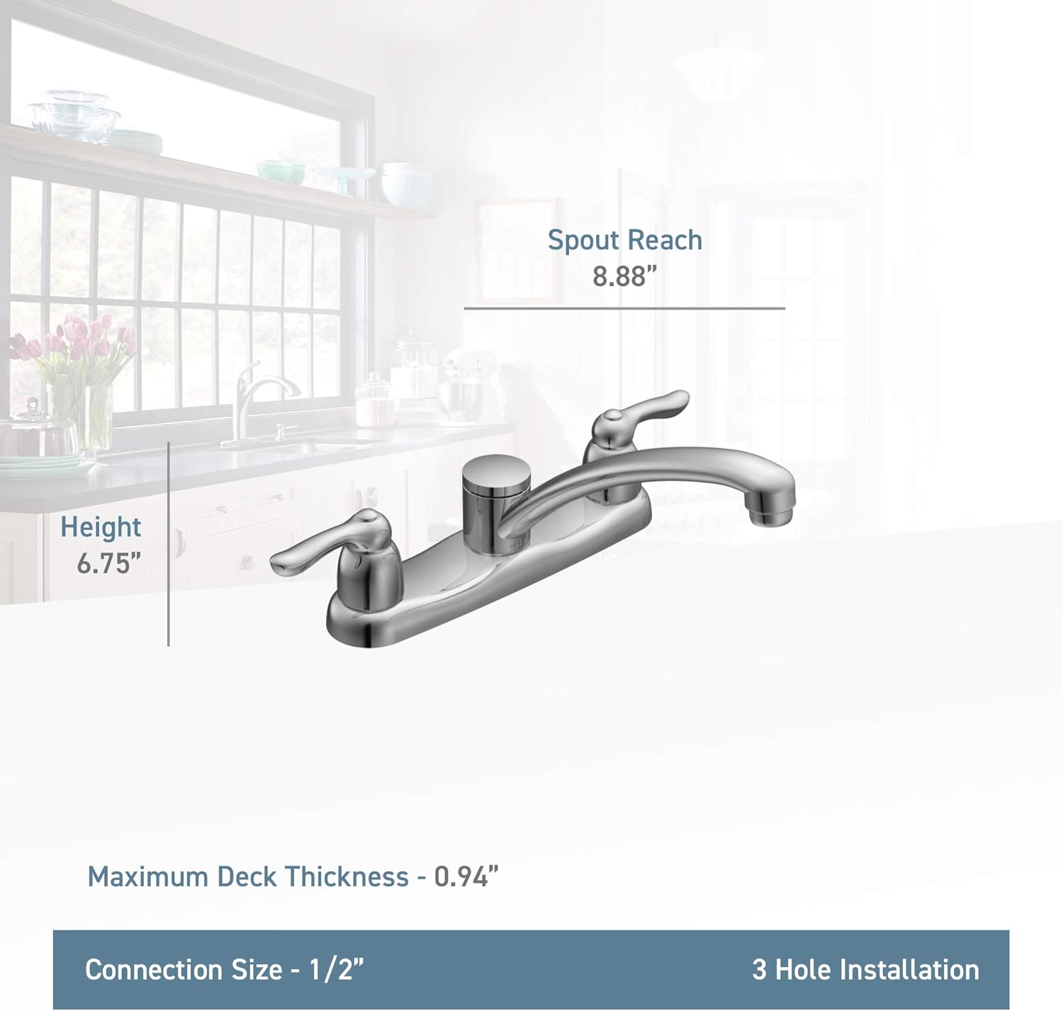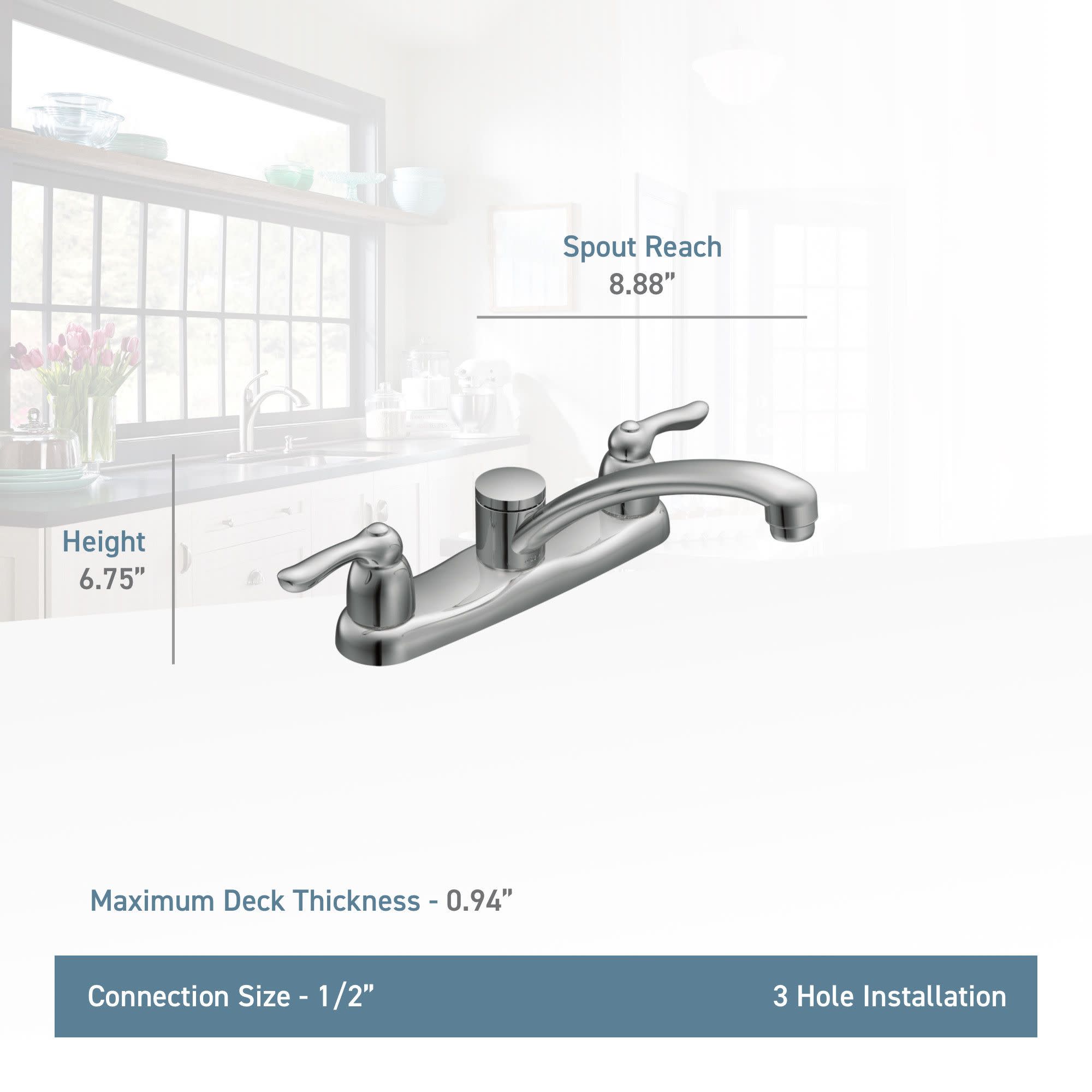 Defined by soft, clean curves, the Chateau 2-Handle Standard Kitchen Faucet offers sleek, modern styling with the reliable functionality you expect from MOEN. Dual lever handles enable precise control over temperature and flow, with color-coded indicators for added temperature safety. The bright chrome finish withstands the test of time, lending a clean and classic look to any kitchen.