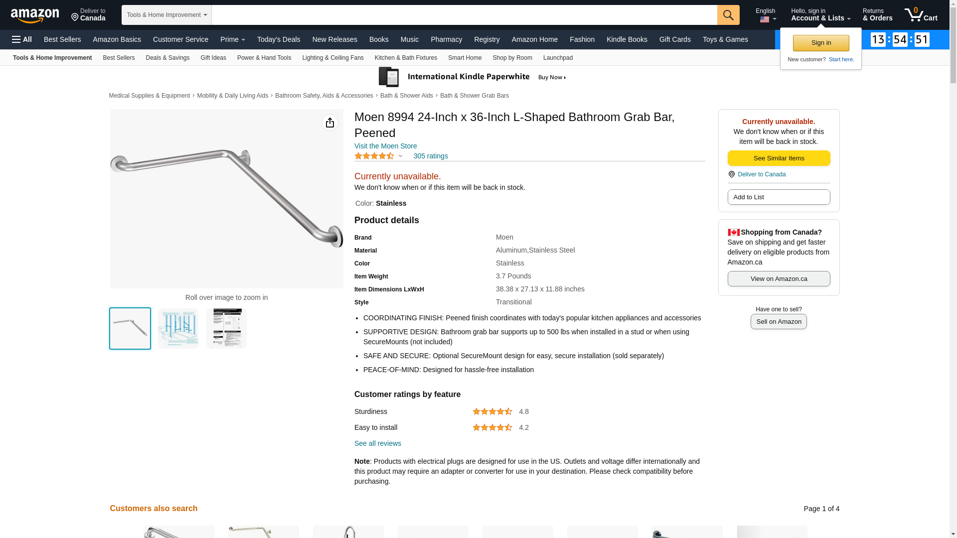 | Feature | 24-by-36-inch L-shaped bathroom grab bar supports up to 500 lbs. |