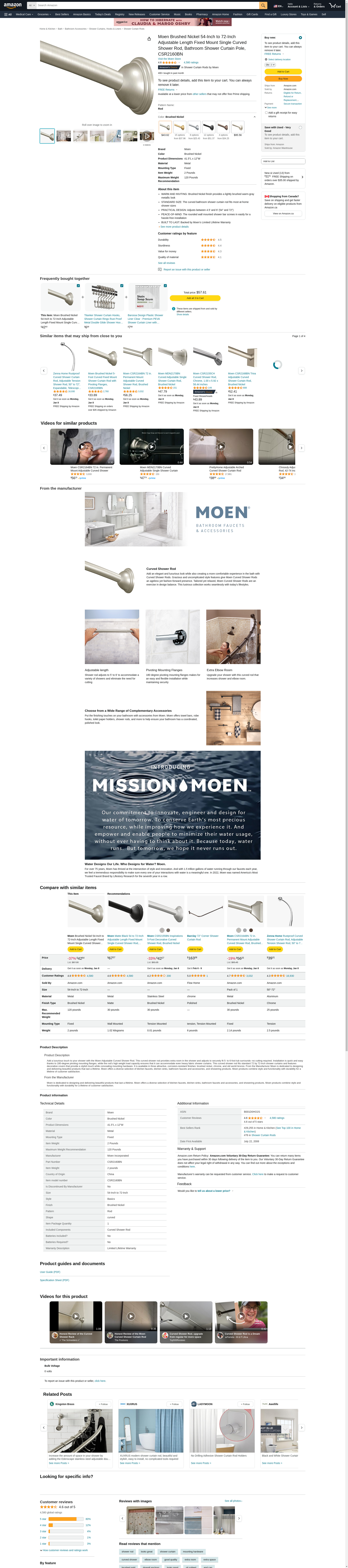 CSR2160BN Finish: Brushed Nickel Features: -Curved Shower Rod. -New pivoting flanges provide an easy, secure installation on uneven wall surfaces. -Ensures durability and provides protection against rust. Product Type: -Shower Rods. Color: -Bronze; Chrome; Nickel. Material: -Metal. Country of Manufacture: -United States. Dimensions: -Adjusts to fit shower enclosures between 54'' and 72''. Overall Height - Top to Bottom: -3.2". Overall Width - Side to Side: -72". Overall Depth - Front to Back: -3.2".