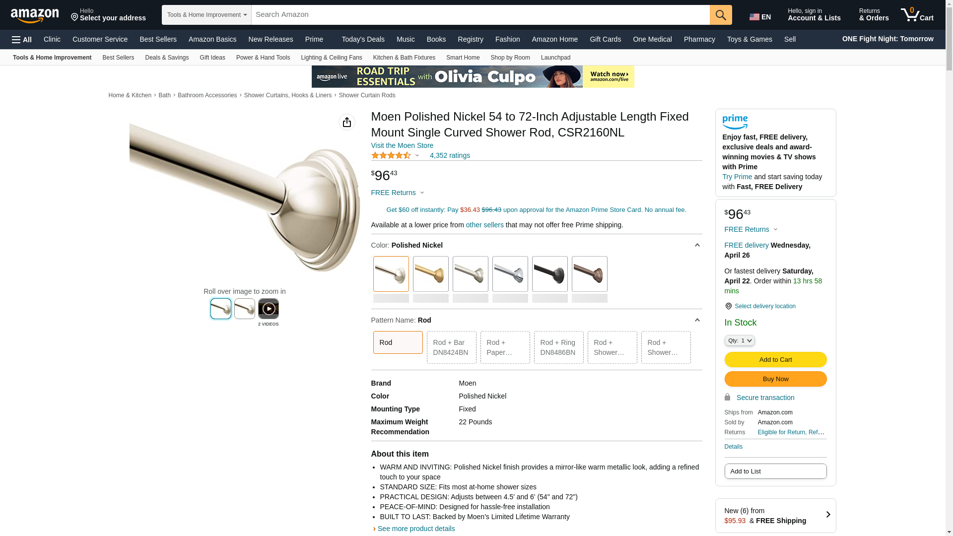 Moen Polished Nickel 54 to 72-Inch Adjustable Length Fixed Mount Single Curved Shower Rod, CSR2160NL