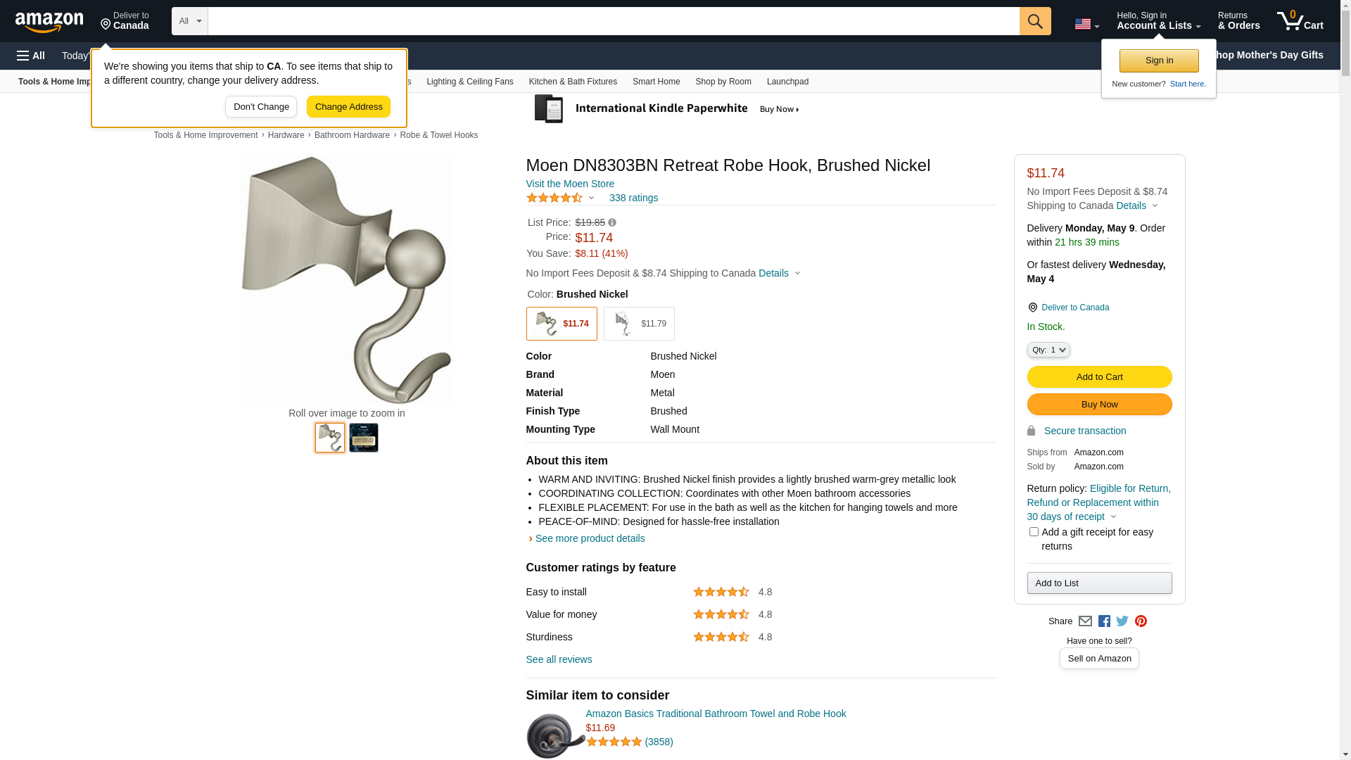 Moen DN8303BN Retreat Robe Hook, Brushed Nickel, 1 Count (Pack of 1)