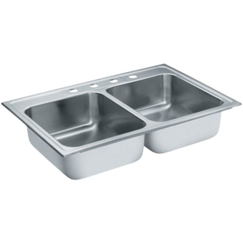 Moen 22218 Camelot 4 Hole Stainless Steel 20 Gauge Double Bowl Drop In Sink, Stainless