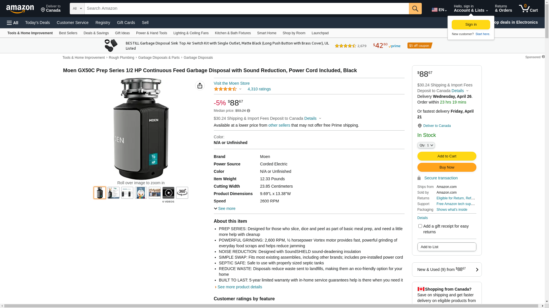Moen GX50C Disposer Prep Series 1/2 HP Continuous Feed Garbage Disposal with Sound Reduction, Power Cord Included