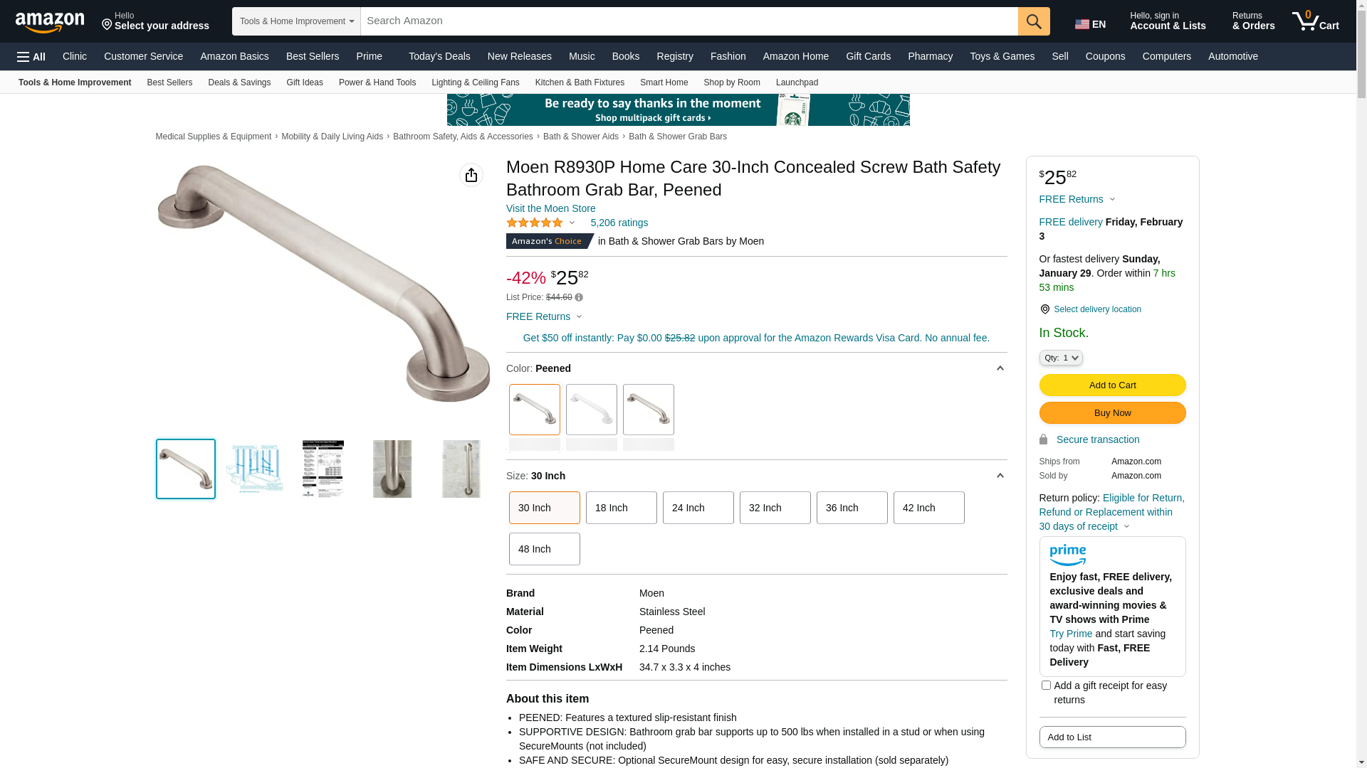 Moen R8930P Peened 30-Inch Grab Bar. Peened finish. Formed from type 304 stainless steel tubing. 1.5-inch bar diamete...