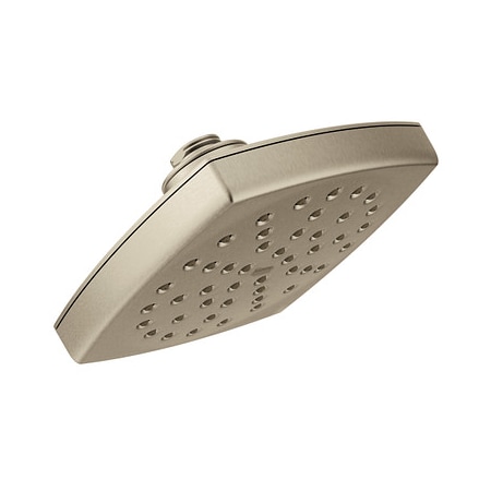Crisp edges and uncomplicated style features give the Voss collection an ageless, yet fashion-forward, presence. Each silhouette brings a confident transitional style to the bath. This brushed nickel one-function 6 in. Dia eco-performance rainshower showerhead was built to last by MOEN. Designed for use in your bath.