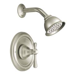 The Kingsley 1-Handle Shower-Only Trim Kit from MOEN puts the finishing touch on your traditional bath buildout. Featuring understated details and a brushed nickel finish to coordinate with most decor schemes, it brings a touch of classiness to your shower space. The accompanying showerhead spans 4-3/8 in. diameter and offers a 2.5 GPM flow rate, furnishing generous rinsing and cleansing throughput with exceptional spray coverage. Leveraging the functionality of a separately sold Moentrol valve, the single-handle faucet lets you adjust water volume and temperature to match your preferred flow and heat intensity. An innovative pressure-balancing feature in the valve helps the temperature remain steady even when other water sources in the home are triggered. Part of the M-PACT common valve system, this set makes it simple to substitute the trim without tweaking the plumbing should your future style preference change. The lustrous brushed nickel finish is laden with a LifeShine protectant to guard against tarnishing, corroding or flaking, backed by a lifetime limited warranty to underscore its durability. This trim kit requires MOEN valve 3510, 3520 or 3570 (sold separately) to complete installation.