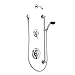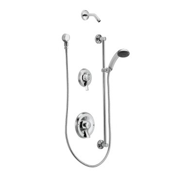 - CONTAINS: stationary showerhead, hand-held shower with non-positive pause, 69" metal hose, 30" slide bar, drop ell,