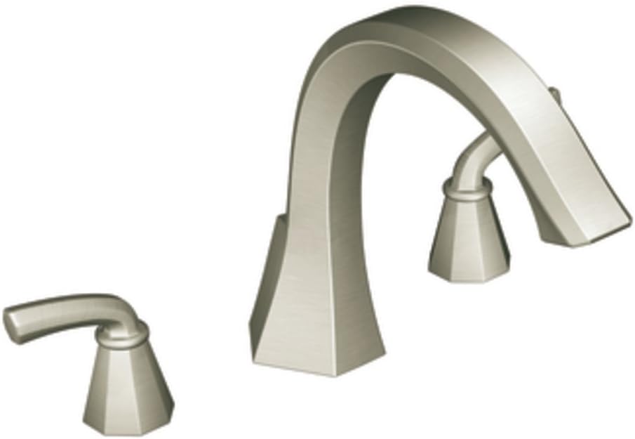 Featuring a design with sweeping horizontal lines and geometric forms, the Moen Felicity 2-Handle Deck-Mount Roman Tub Faucet Trim in Brushed Nickel adds dramatic style to your bathroom. This product's warm, metallic finish offers tarnish resistance to help ensure that it remains attractive over time.