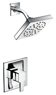 The 90-Degree Eco-Performance Shower Faucet Trim Kit from MOEN features right-angled design elements and crisply honed edges to put the finishing touch on your modern bathroom buildout. A square rain showerhead spanning 6 in. dispenses water at 1.75 GPM, earning WaterSense distinction for its conservative output. The single-spray action is amplified with self-pressurizing MOEN Immersion technology to accelerate water flow, supplying robust coverage while keeping utility bills low. A single lever on the faucet rotates 270 degrees to dial in your preferred heat intensity, held steady by a compatible PosiTemp pressure-balancing control valve. Part of the M-PACT common valve system, this set makes it simple to substitute the trim without tweaking the plumbing should your future style preference change. The mirror-like chrome finish offers high reflectivity for a sparkling look that coordinates with any design scheme for versatile use. This kit requires MOEN valve 2510, 2520, 2570, 2580 or 2590 (sold separately) to complete installation.