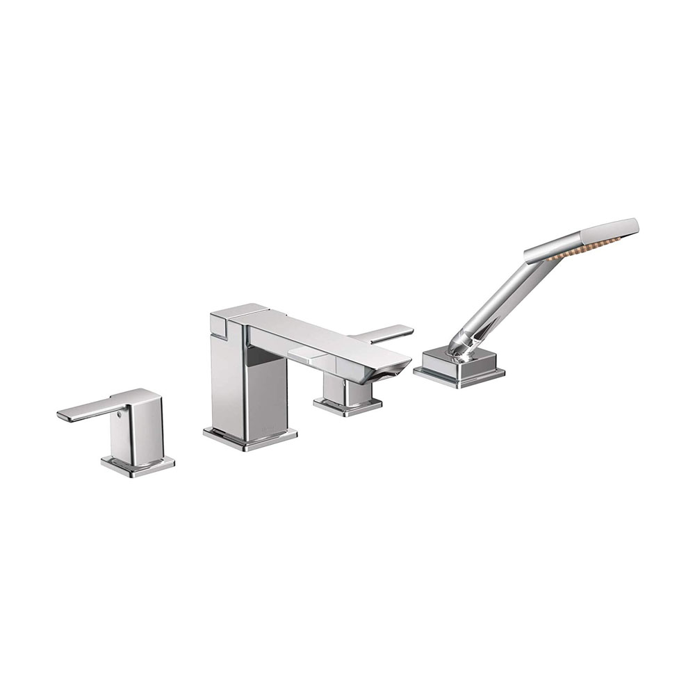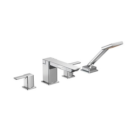 With its ultra-contemporary styling, 90? brings a clean. Minimalist aesthetic to the home. This chrome two-handle high arc roman tub faucet includes hand shower was built to last by MOEN. This trim kit requires MOEN valve 9792, 9793, 9796, or 9797 to complete installation.