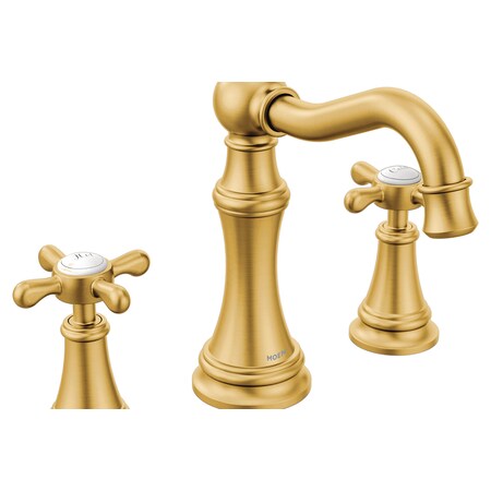 Now, big savings on the Moen Weymouth Brushed Gold Two-Handle, High Arc Widespread Bathroom Faucet with Cross Handles, 1.2 GPM - TS42114BG on PlumbersStock.com. Improve your home with Moen.