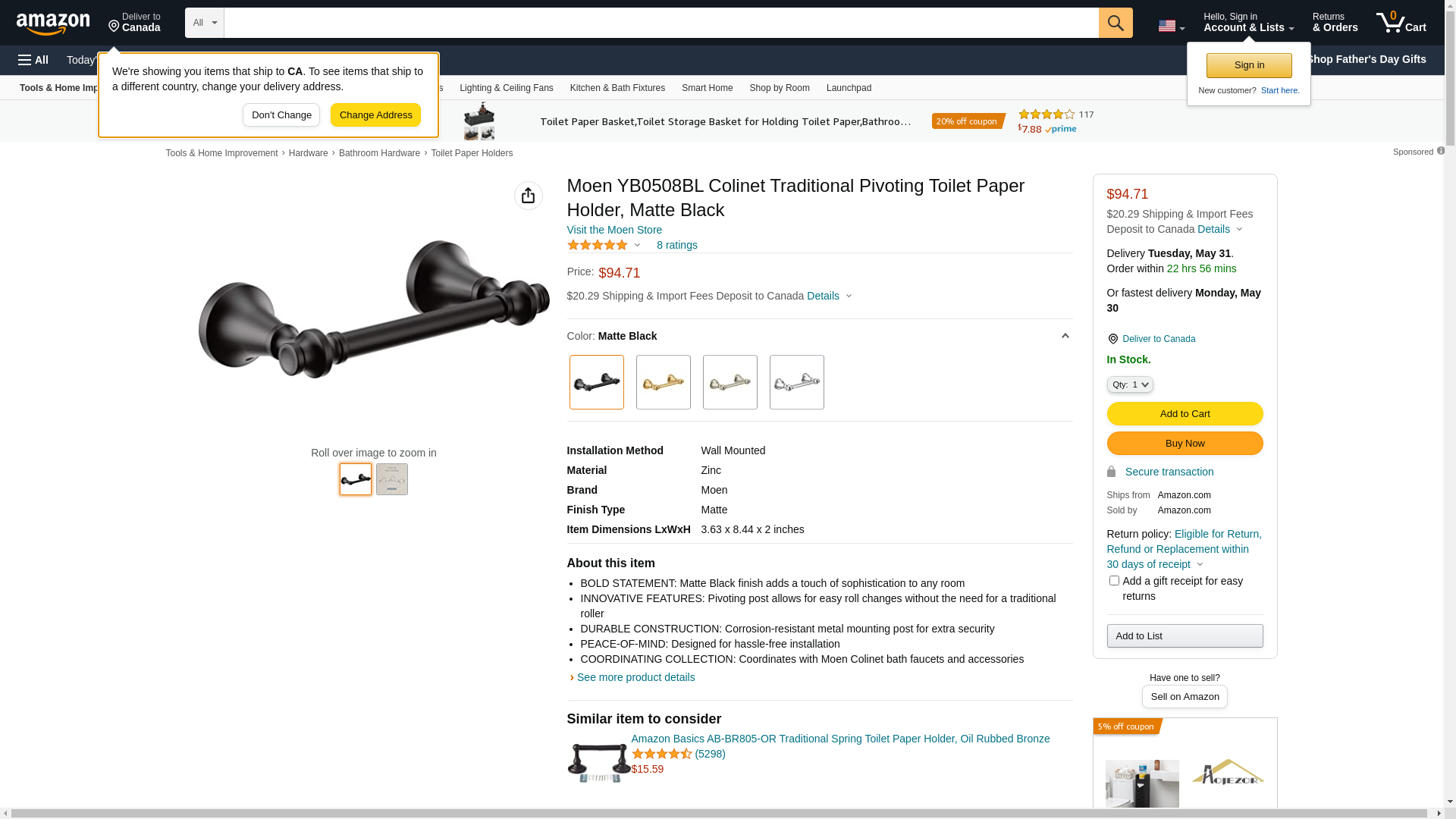 Moen - YB0508BL - Matte Black Pivoting Paper Holder