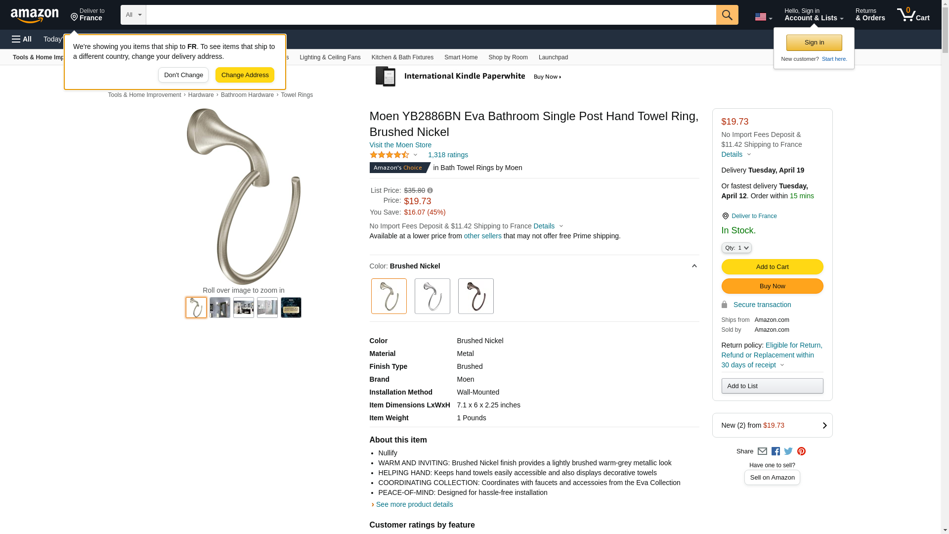 Moen YB2886BN Eva Bathroom Single Post Hand-Towel Ring, Brushed Nickel