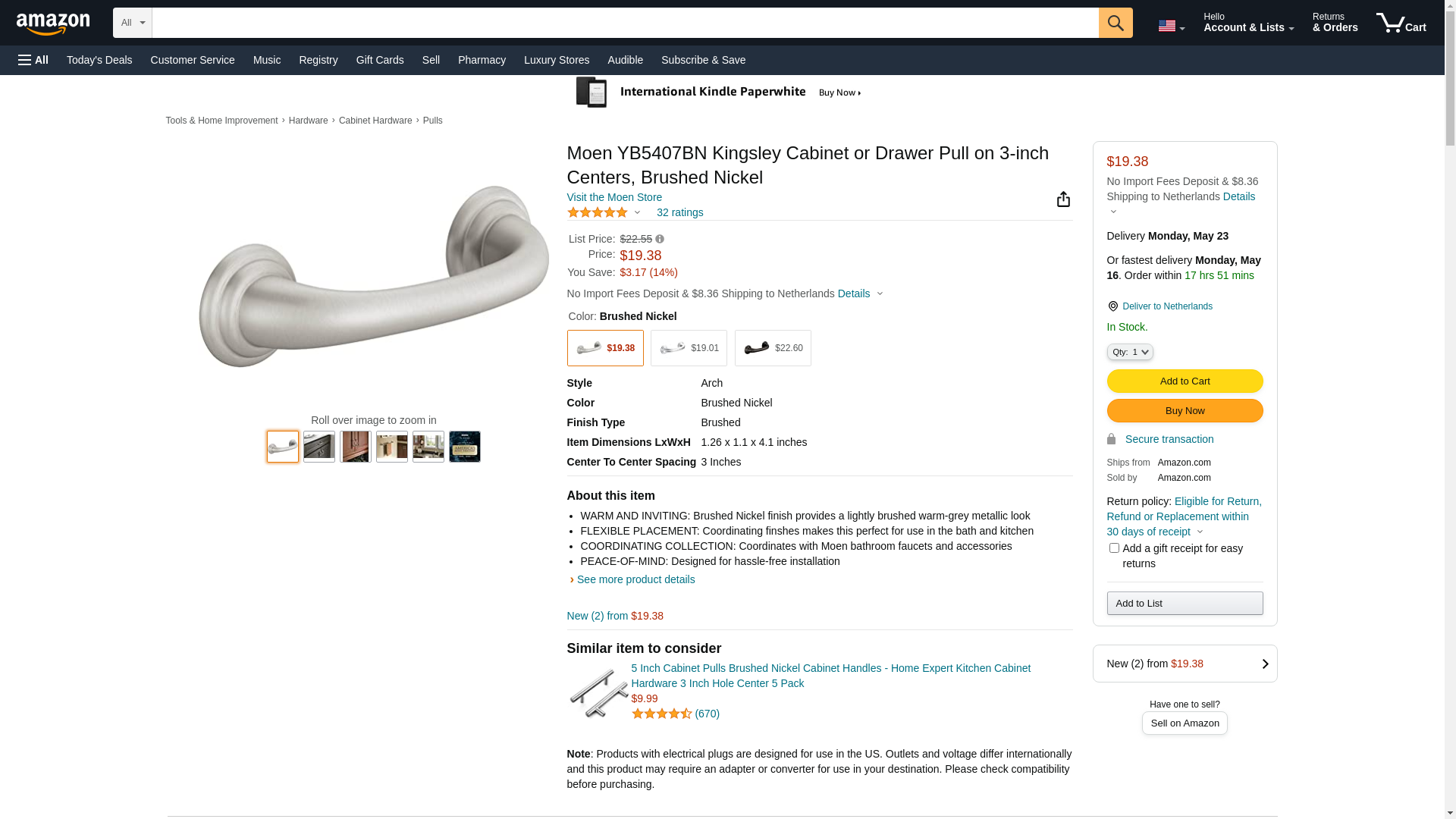YB5407BN Finish: Brushed Nickel Features: -Drawer pulls. -1 per pack. Style: -Contemporary. Primary Material: -Metal. Pull Type: -Arch pull. Dimensions: Overall Height - Top to Bottom: -4.1". Overall Width - Side to Side: -1.1". Overall Depth - Front to Back: -1.26". Overall Product Weight: -0.24 lbs.