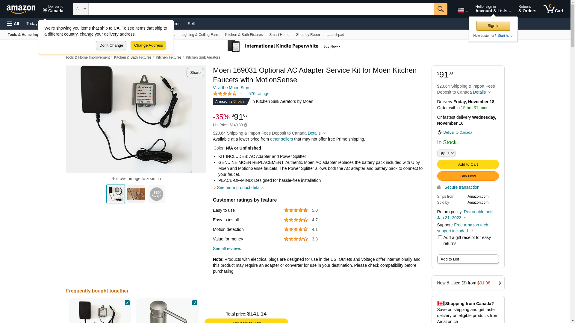 Moen 169031 Optional AC Adapter Service Kit for Moen Kitchen Faucets with MotionSense