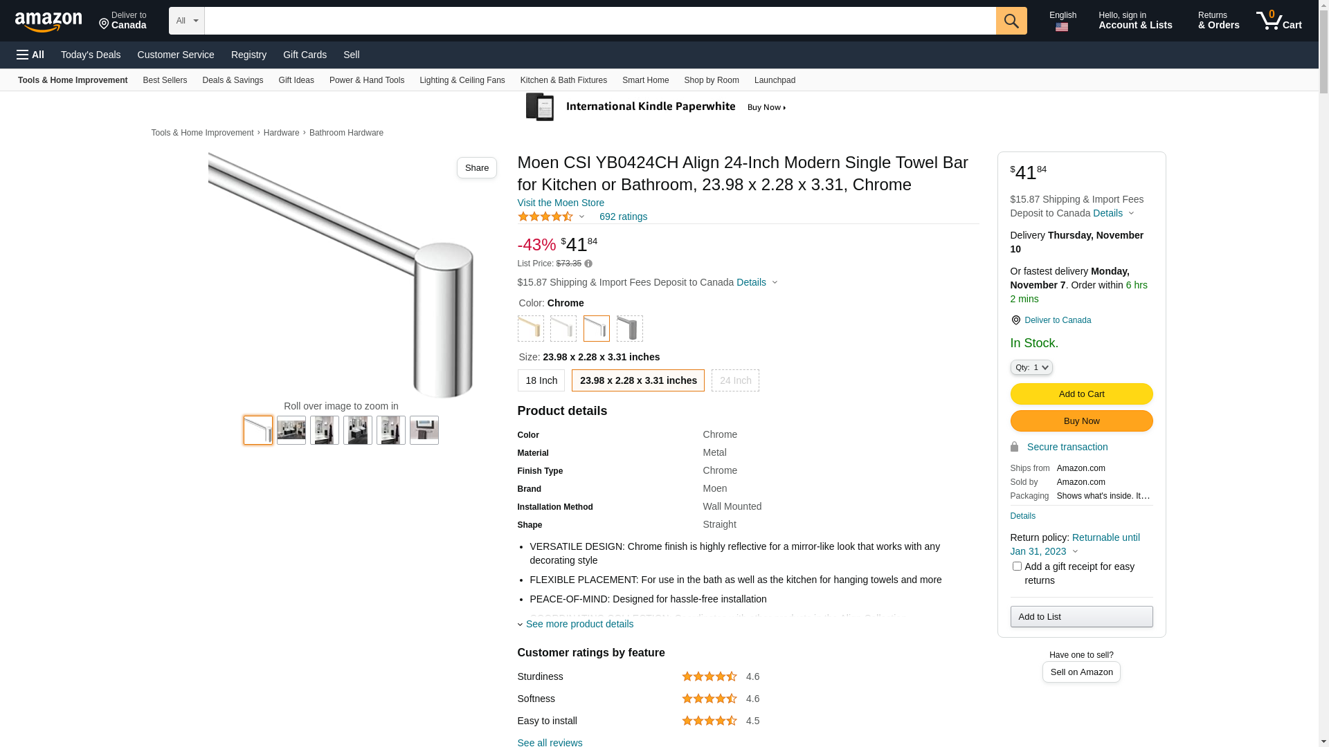 CSI YB0424CH Moen Align 24-Inch Bathroom Towel Bar, Chrome