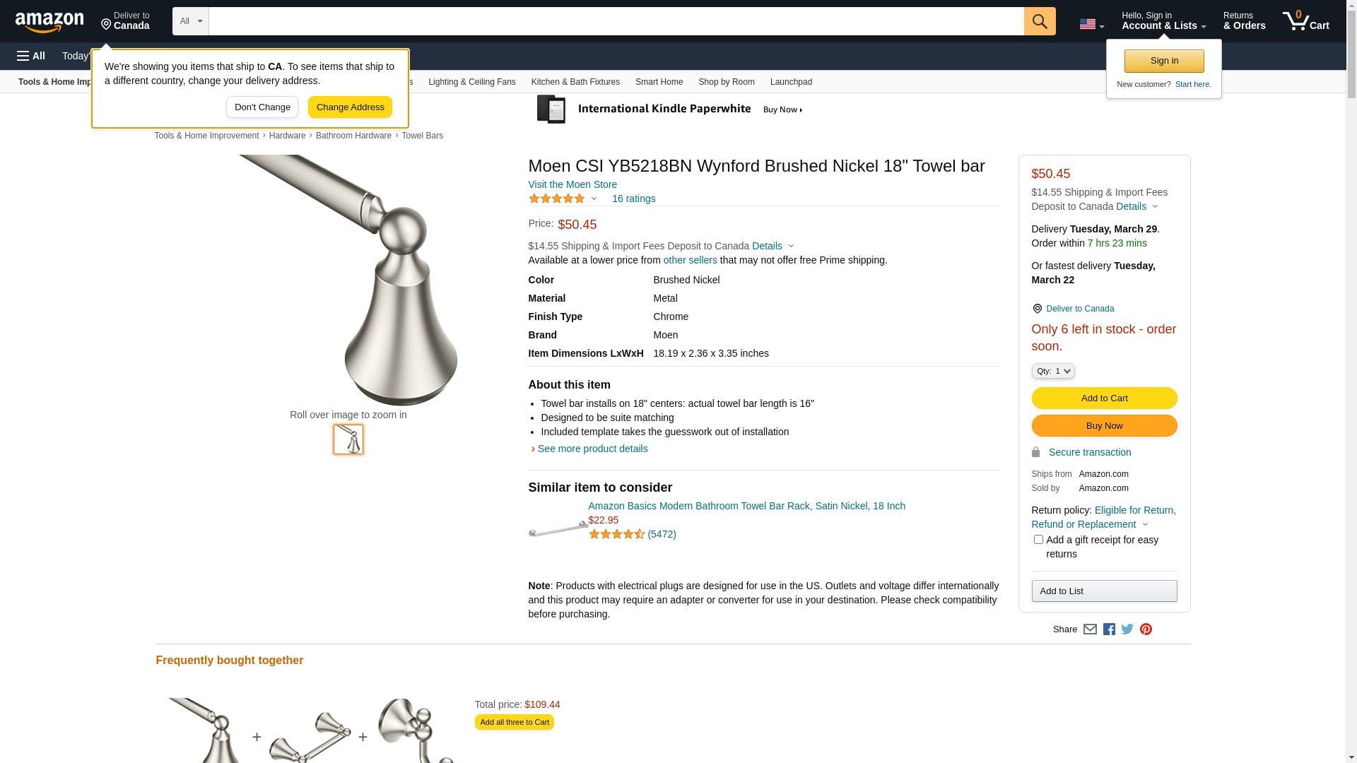 CSI YB5218BN Moen YB5218 Wynford 18" Towel Bar, Brushed Nickel