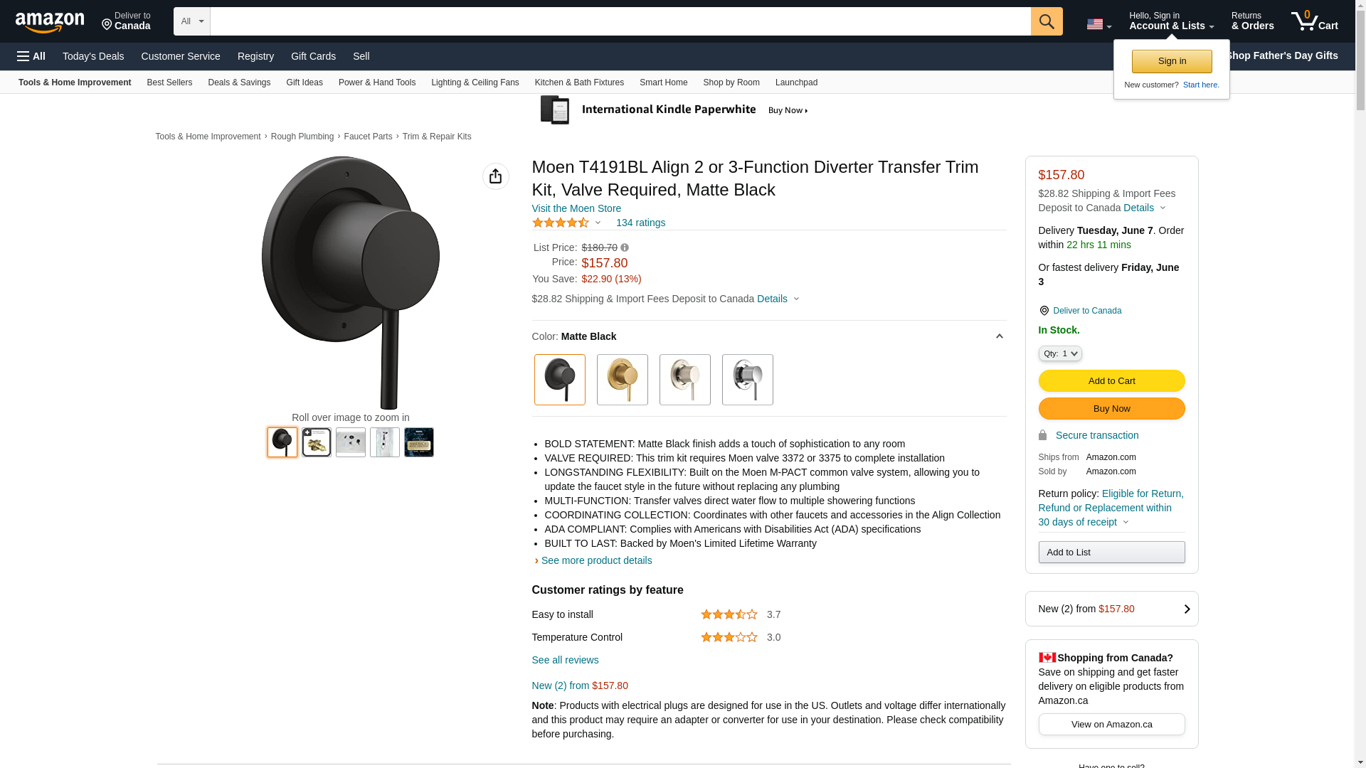 Moen Align Matte Black 2 or 3-Function Diverter Transfer Trim Kit, Valve Required, T4191BL