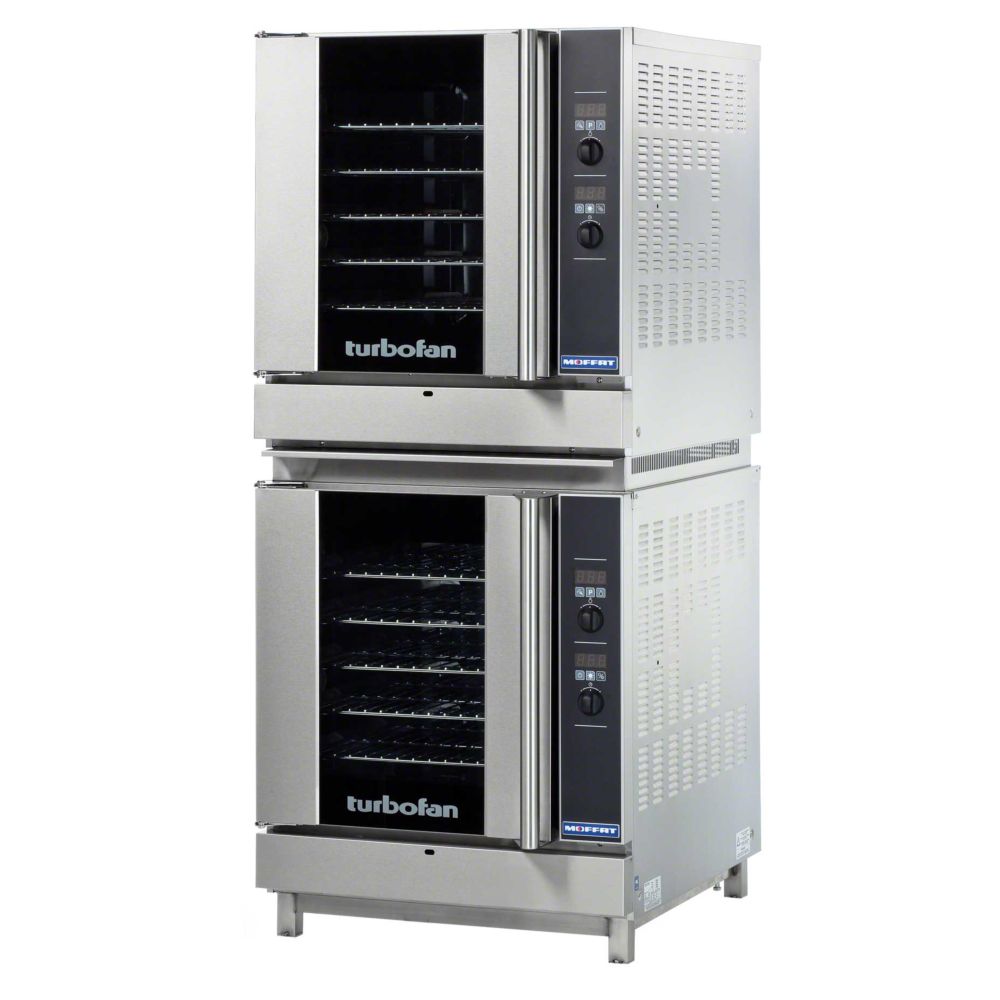 Turbofan Convection Oven, gas, full-size, double stacked units, 71-1/4" assembled height, digital controls, temperature range 140 - 500° F, 1-hour cook cycle timer & 3-hour hold timer, 3-1/3" tray spacing, water injection, (5) full-size sheet pan capacity, stainless steel exterior, with glass door, porcelain interior, 66,000 BTU, includes stacking kit, ENERGY STAR, cETLus, CSA, NSF<br/>The easy-to-use Moffat G32D5/2 Turbofan Convection Oven comes in handy when you need to cook and bake a variety of meals. This oven runs on gas. This stainless steel oven is 71.25 inches tall, 28.88 inches wide, and 31.88 inches deep. This is a Energy Star-certified appliance.