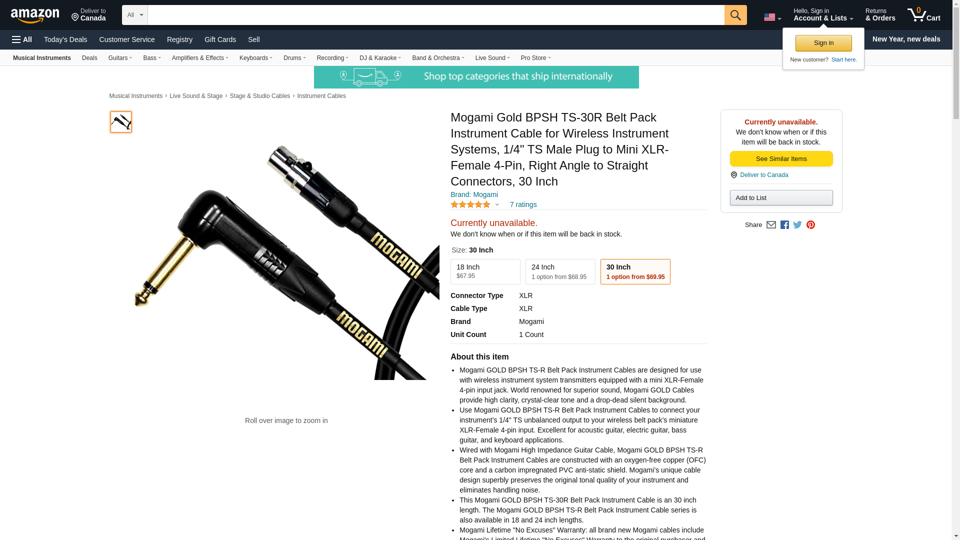 - This Mogami GOLD BPSH TS-30R Belt Pack Instrument Cable is an 30 inch length. The Mogami GOLD BPSH TS-R Belt Pack Instrument Cable series is also available in 18 and 24 inch lengths.