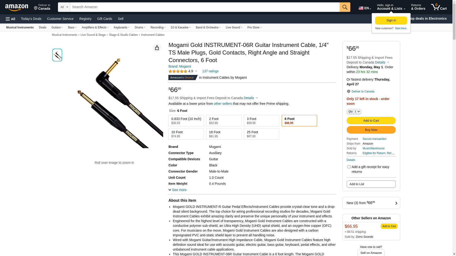 - This Mogami GOLD INSTRUMENT-06R Guitar Instrument Cable is a 6 foot length. The Mogami GOLD INSTRUMENT-R Guitar Instrument Cable series is also available in a 10 inch length and 2, 3, 10, 18, and 25 foot lengths.