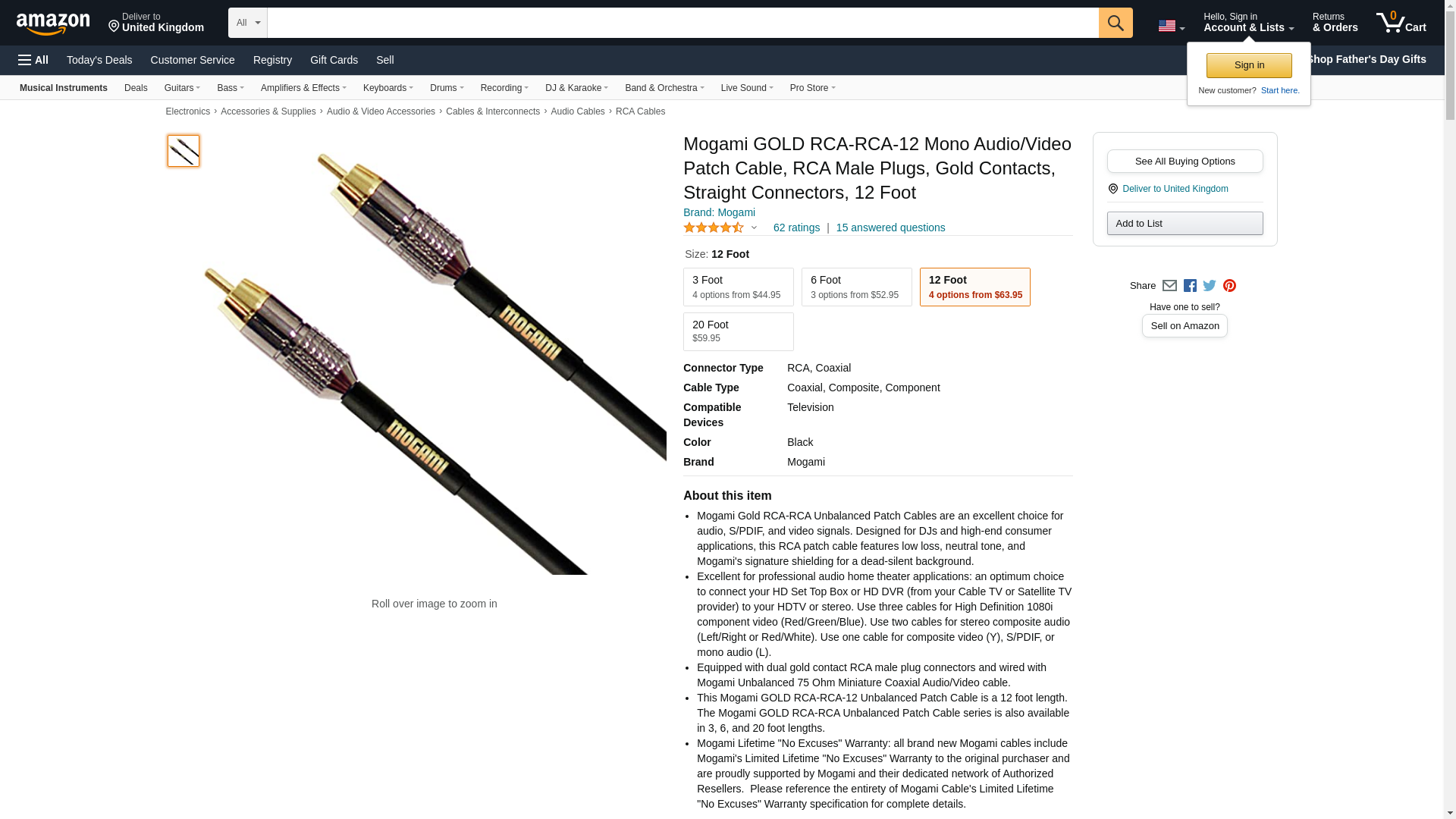 - This Mogami GOLD RCA-RCA-12 Unbalanced Patch Cable is a 12 foot length. The Mogami GOLD RCA-RCA Unbalanced Patch Cable series is also available in 3, 6, and 20 foot lengths.