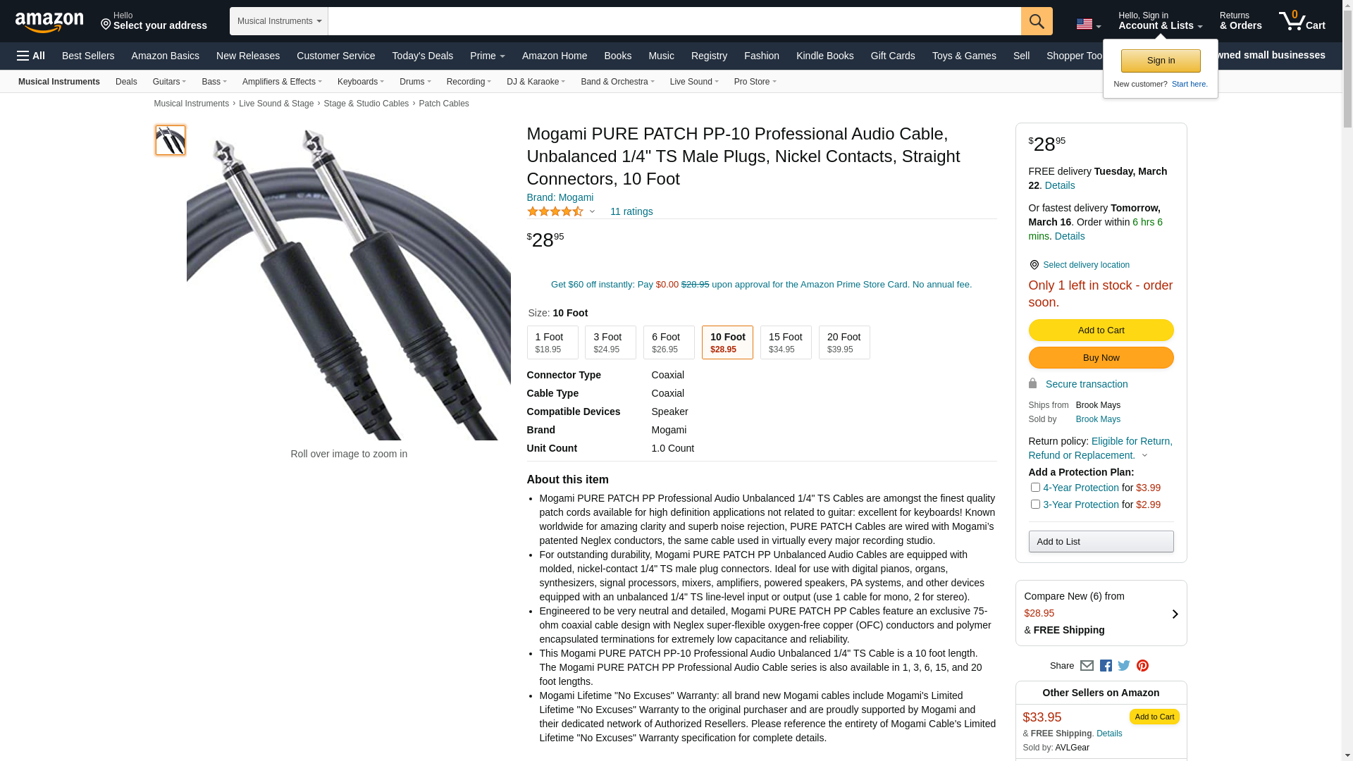 | Feature | Mogami PURE PATCH PP Professional Audio Unbalanced 1/4" TS Cables are amongst the finest quality patch cords available for high definition applications not related to guitar: excellent for keyboards! Known worldwide for amazing clarity and superb noise rejection, PURE PATCH Cables are wired with Mogami\'s patented Neglex conductors, the same cable used in virtually every major recording studio. |