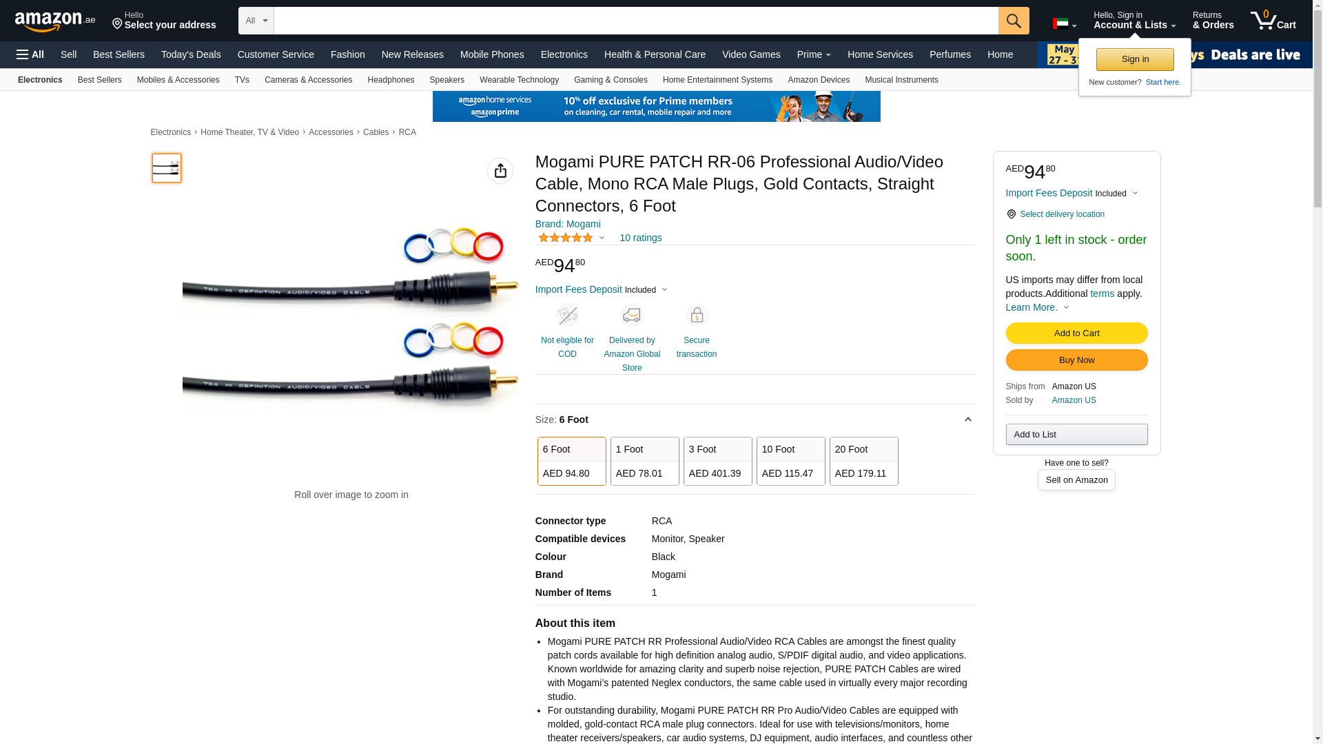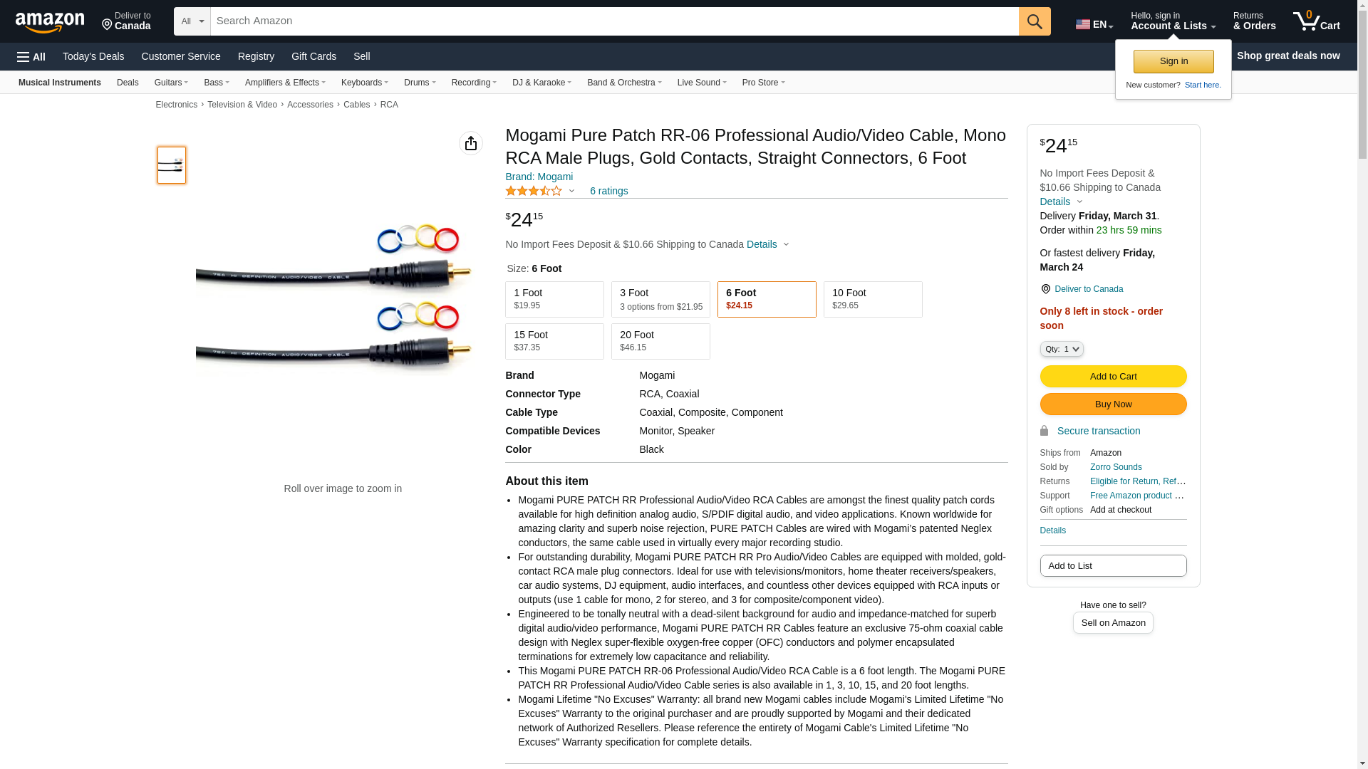 Mogami Pure Patch RR-06 Professional Audio/Video Cable, Mono RCA Male Plugs, Gold Contacts, Straight Connectors, 6 Foot