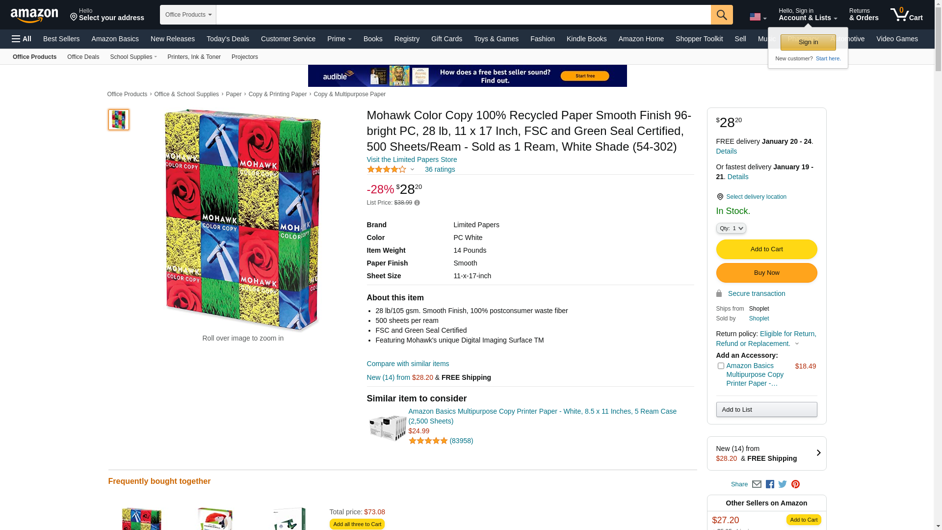 Mohawk Color Copy 100% Recycled Paper Smooth Finish 96-bright PC, 28 lb, 11 x 17 Inch, FSC and Green Seal Certified, 500 Sheets/Ream - Sold as 1 Ream, White Shade (54-302)