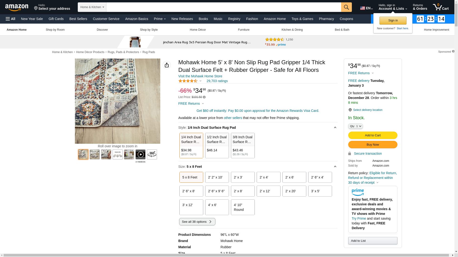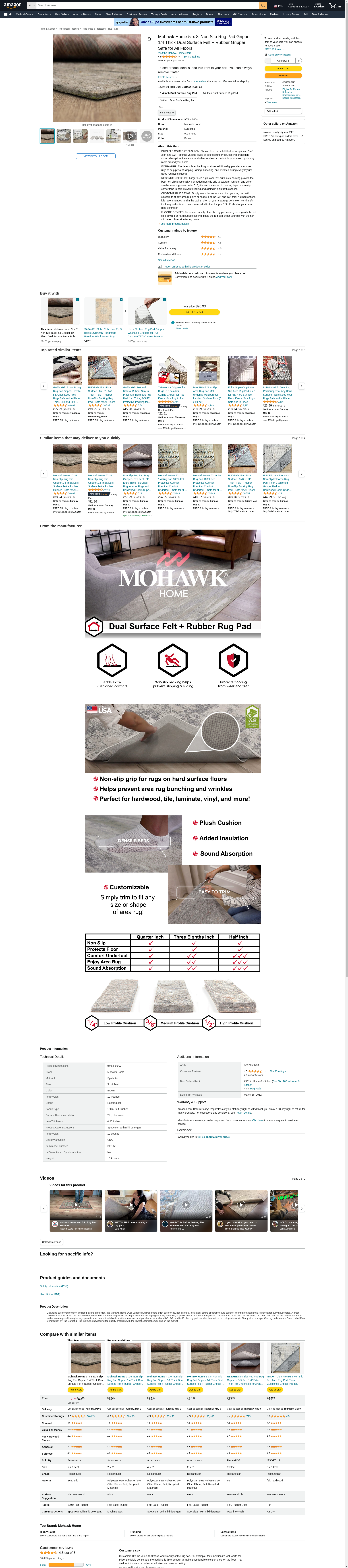 Mohawk Home Dual Surface Felt and Latex Non Slip Rug Pad, 5'x8', 1/4 Inch Thick, Safe for Hardwood Floors and All Surfaces: Maxedbuy.com