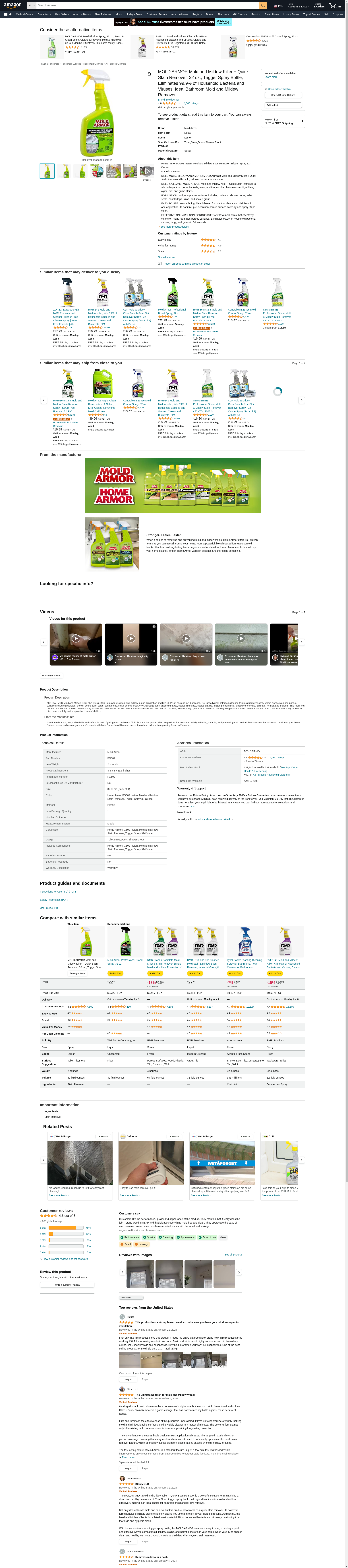 MOLD ARMOR Mold and Mildew Killer + Quick Stain Remover, 32 oz., Trigger Spray Bottle, Eliminates 99.9% of Household Bacteria and Viruses, Ideal Bathroom Mold and Mildew Remover