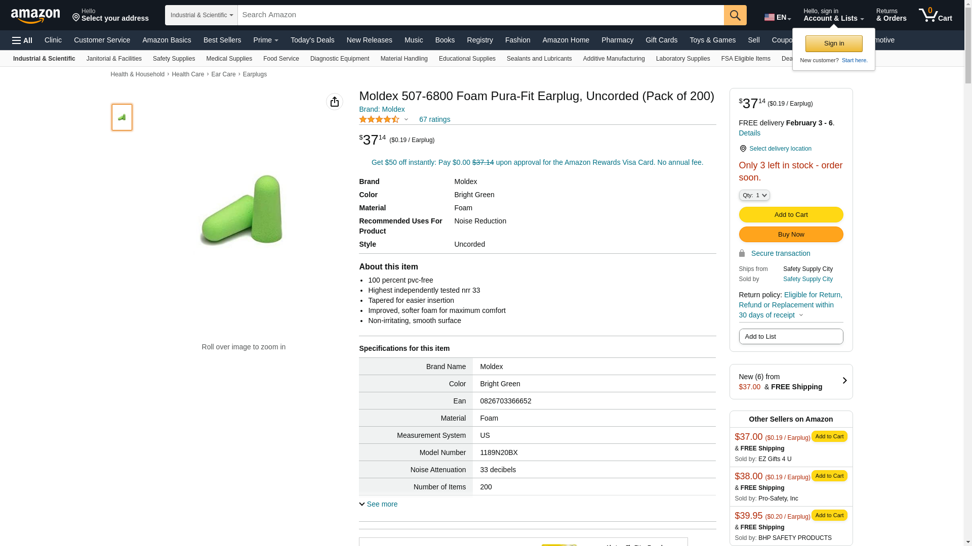 Moldex 507-6800 Foam Pura-Fit Earplug, Uncorded (Pack of 200)