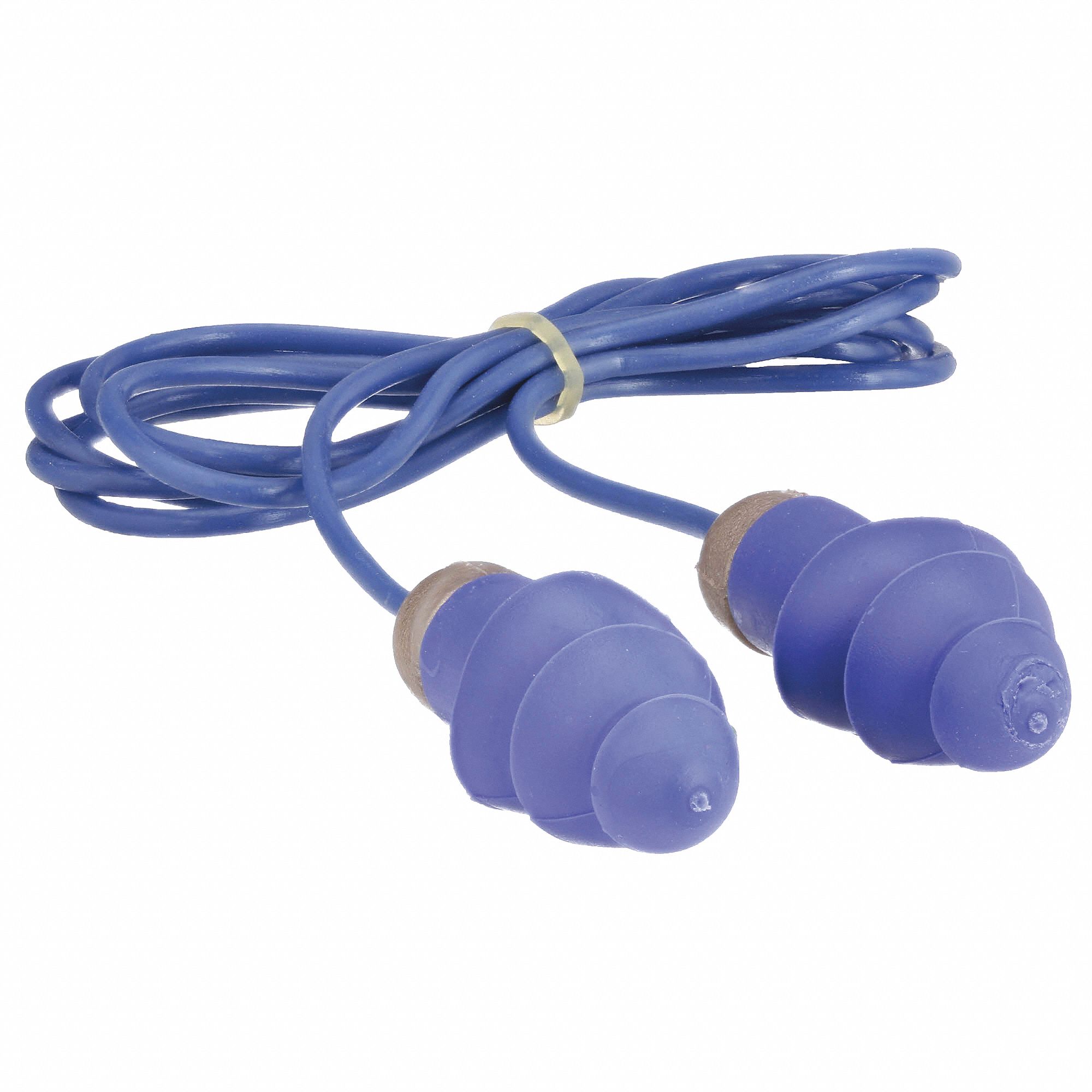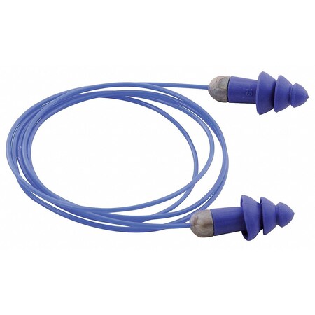 Metal-detectable, corded, reusable earplugs; blue color; soft, flexible flanges; easy grip handles; 100% PVC free; NRR 27dB; meets ANSI S3.19-1974; packaged 50 PR/DP, 4 DP/CS