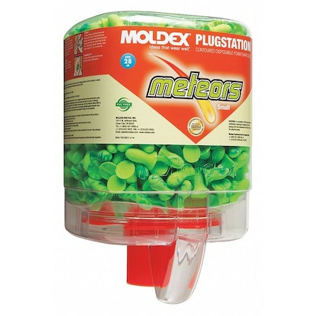 PlugStation w/ Meteors smallManufactured By: Moldex MetricFoam roll-down earplugs feature a unique undercut shape with a smaller diameter that fits comfortably in narrower part of ear canal.Larger base ensures proper insertion, fit and removal.100% PVC-free slow-recovery foam molds with individual contours of ear canal, and soft, smooth surface will not irritate skin.Available in a small size for women and other workers with smaller ear canals.Available with recyclable PlugStation dispenser.Bright green color for easy compliance tests.Tested to ANSI S3.19-1974. The random color patterns and bright green color on Meteors are a registered trademark of Moldex-Metric, Inc.