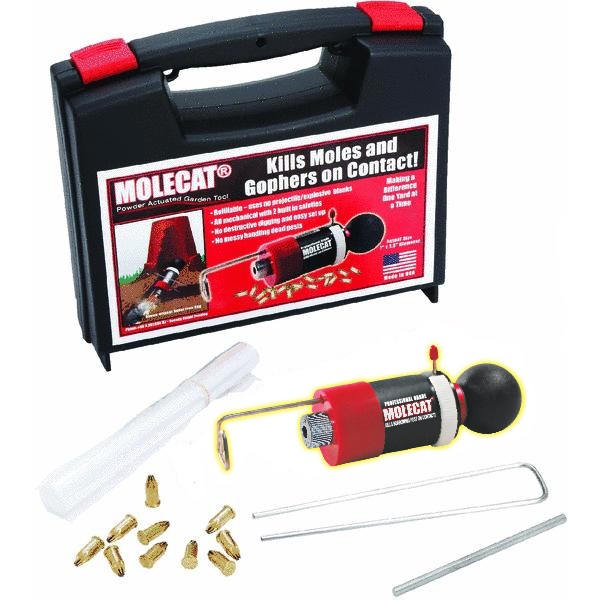 MOLECAT is a durable and precisely engineered product that is 100% effective at killing burrowing pests. After anchoring securely into the exit hole, the trigger safety is rotated followed by turning the knob to the fire position. As the pest comes in contact with the trigger, the knob releases a powerful internal spring that detonates the Blank cartridge, creating the no projectile explosive blast. The intense shockwave blows the pest into the tunnel for a swift kill. A red reset ring indicates when the cartridge has discharged. More efficient than a trap because the blast goes in all air spaces.