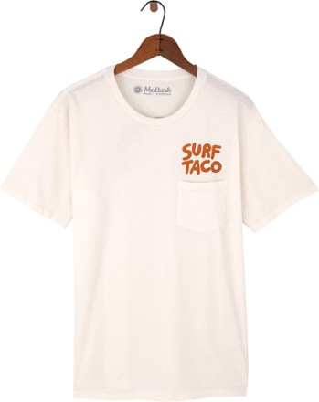 This soft, knit Mollusk Surf Taco T-shirt in a men's slim fit is an ode to everyone's favorite post-surf meal?the taco. Stash extra condiments in the handy chest pocket.
