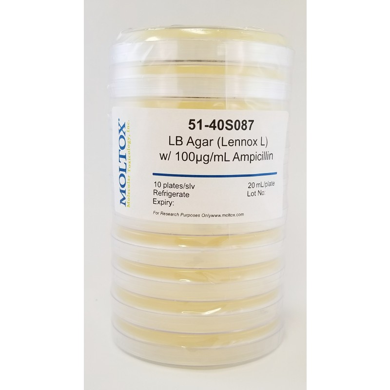 51-40S087, LB Agar w/100ug/ml Ampicillin, Plated Agar, 20 ml/plate, Culture Media, Moltox Ohaus Scale, Magnetic Stirrer, Vortex Mixer, Sample Prep, Centrifuge