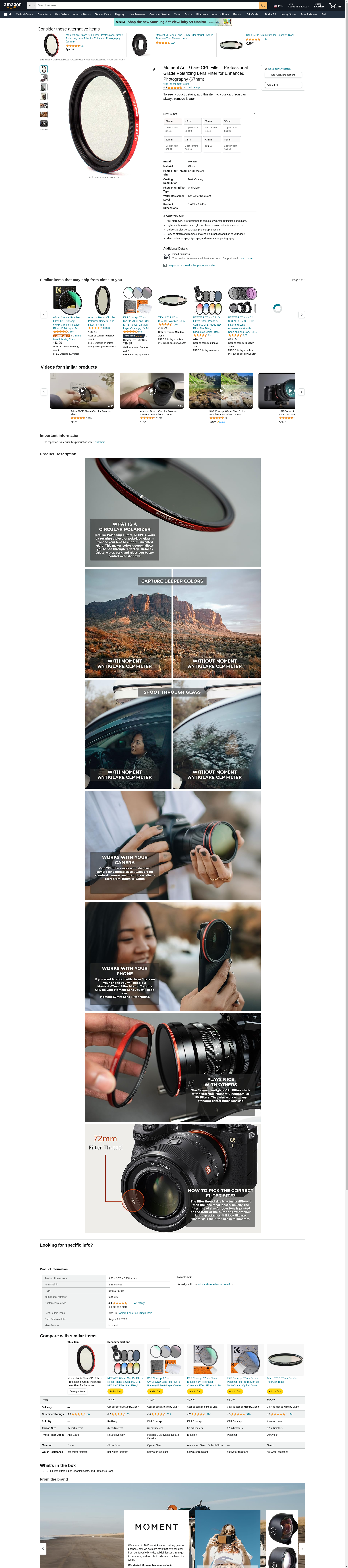 Take your photography to the next level with the Moment Anti-Glare CPL Filter. Expertly designed to reduce glare and unwanted reflections, this filter helps you capture vibrant, high-contrast images even in challenging lighting conditions. Made with high-quality, multi-coated glass, it increases color saturation and enhances detail, delivering professional-grade results with every click. Easy to attach and remove, this filter is a practical addition to your camera gear. Whether you're photographing landscapes, cityscapes, or waterscapes, the Moment 67mm Anti-Glare CPL Filter ensures every shot you take is crisp, clear, and beautifully rendered.