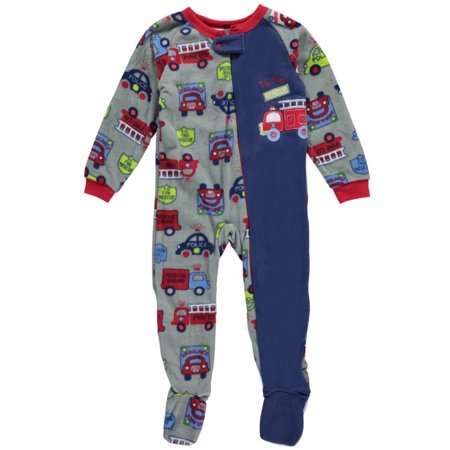 Give him the warm comfort and colorful graphic of these Mon Petit footed pajamas! Mon Petit footed pajamas Poly flannel construction Ribbed contrast trim Full zip Embroidered design Grippy feeties 100% polyester Flame resistant Machine wash cold, gentle Imported