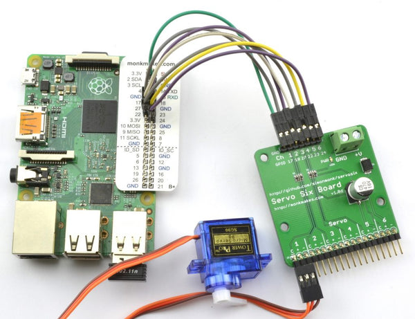 snippetThe Servo Six board simplifies the process of connecting up to six servo motors to a Raspberry Pi or Arduino. The Servo Six has the following features: Screw terminals for servo power supply Reverse-polarity protection for the servo power supply 470?F 16V capacitor for servo supply 470? current limiting resistors for s