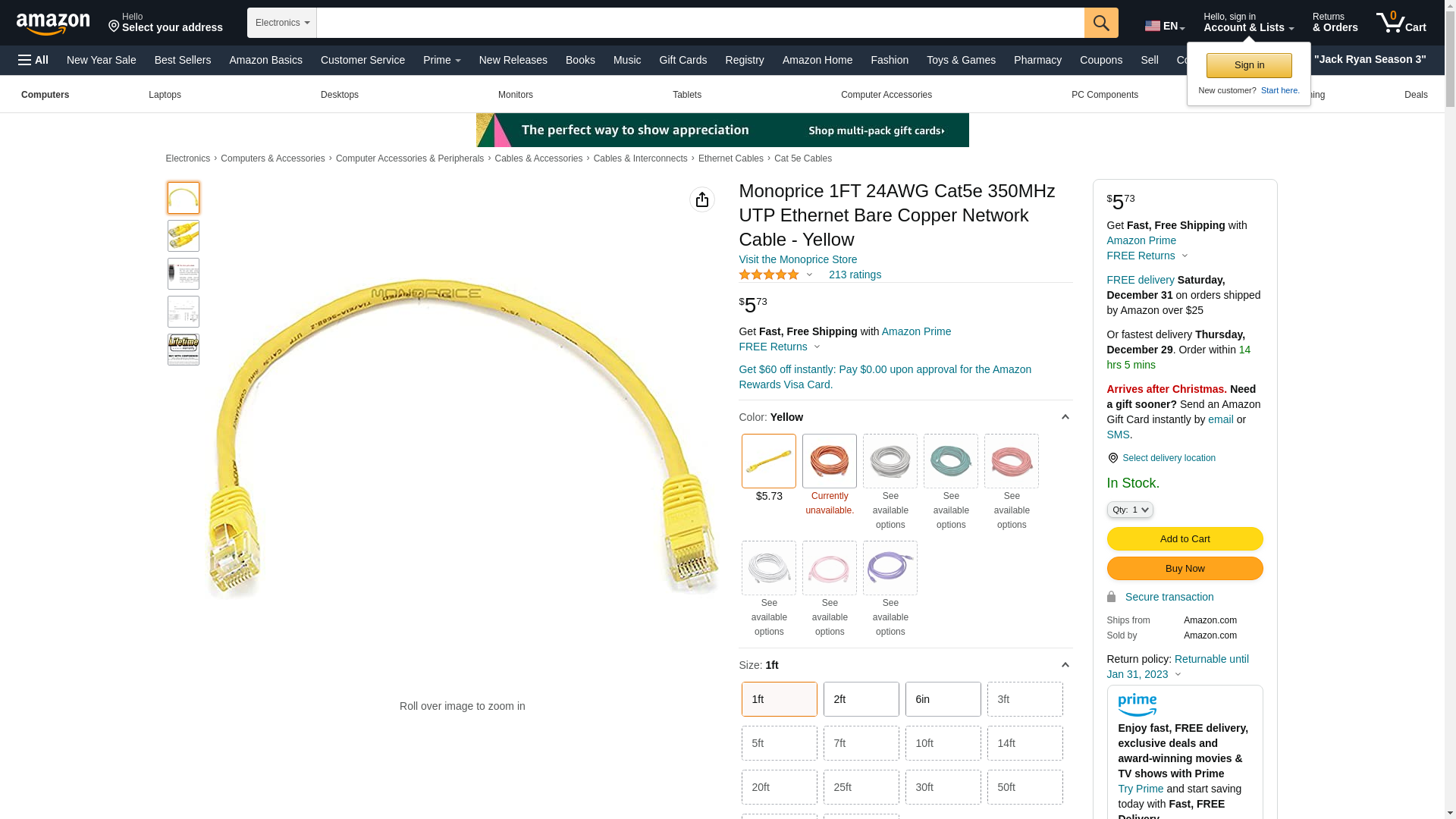 Monoprice 1FT 24AWG Cat5e 350MHz UTP Ethernet Bare Copper Network Cable - Yellow