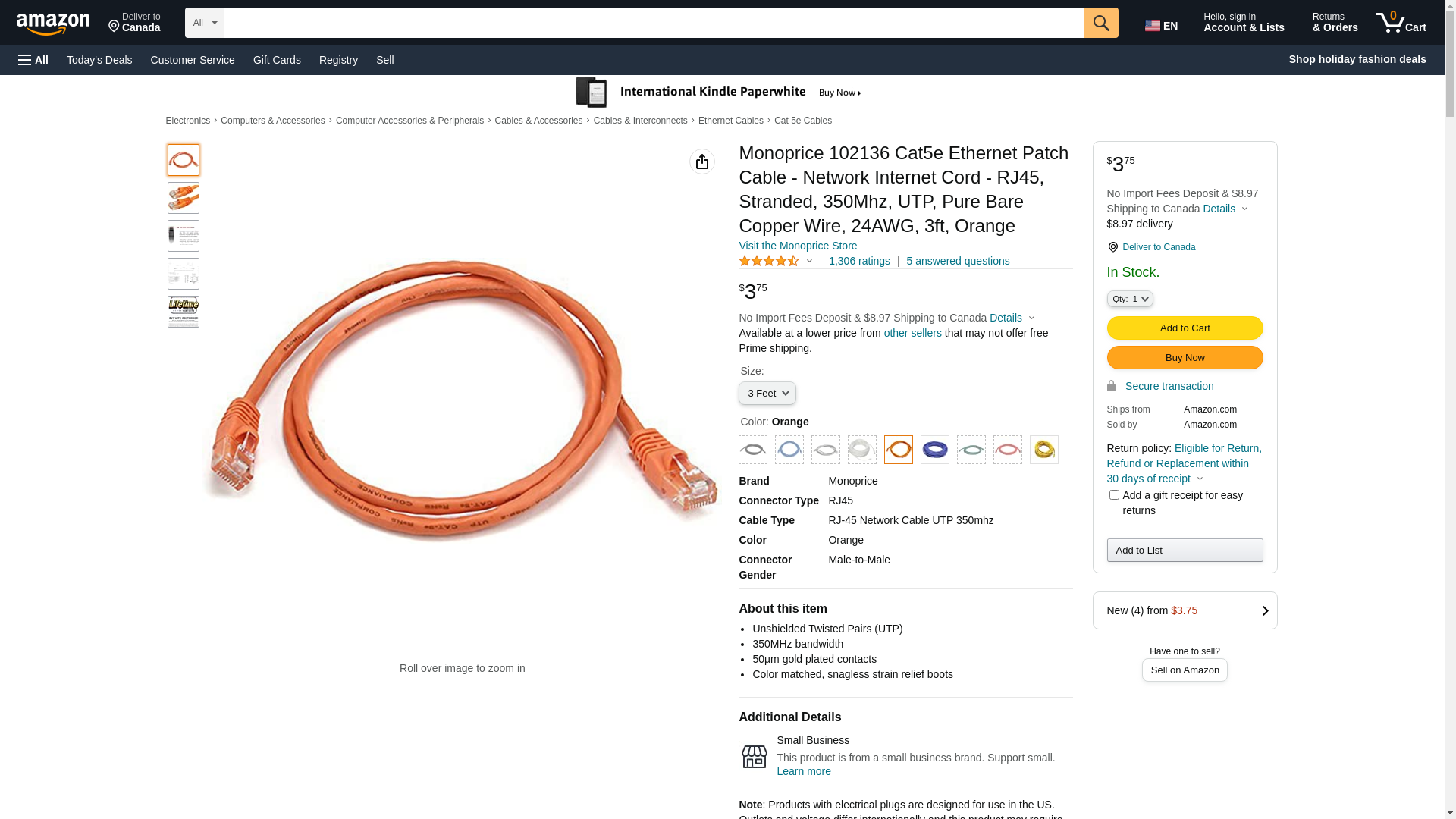 Monoprice 102136 3-Feet 24AWG Cat5e 350MHz UTP Bare Copper Ethernet Network Cable, Orange (102136). Monoprice Cat5e f...