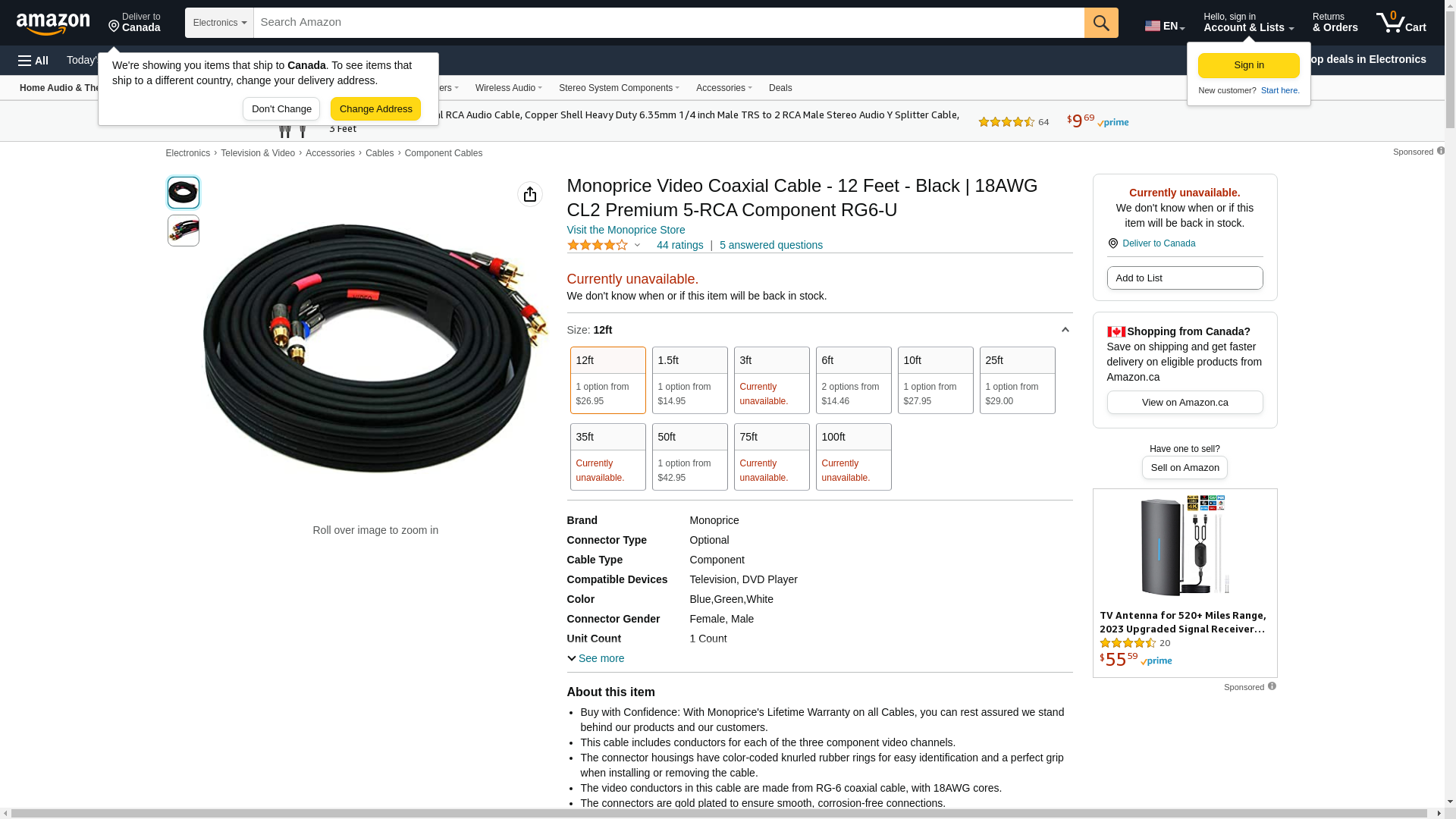 Monoprice Video Coaxial Cable - 12 Feet - Black | 18AWG CL2 Premium 5-RCA Component RG6-U