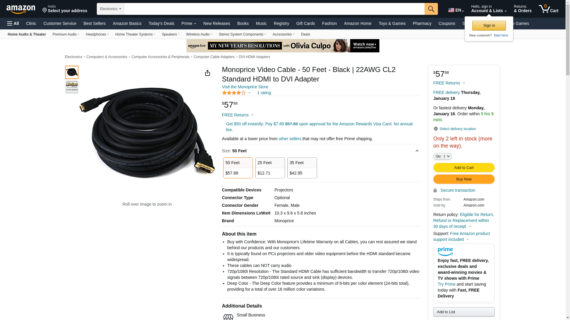 Monoprice Standard HDMI to DVI Adapter Video Cable - Up to 1080i, CL2 in-Wall Rated, 22AWG, 50 Feet, Black